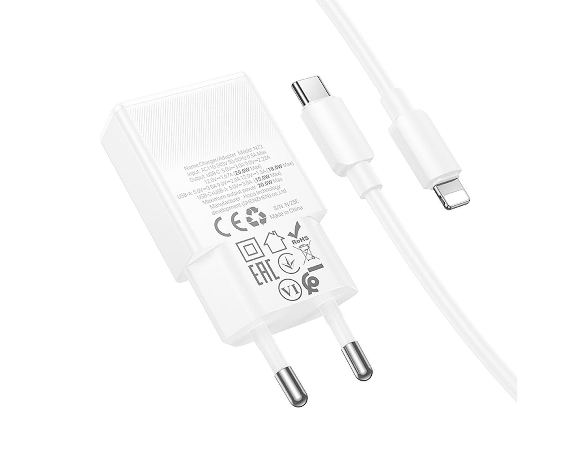 Адаптер Сетевой с кабелем Hoco N73 Mini PD+QC3.0 USB/Type-C 20W (Type-C/Lightning) (white) (242973)
