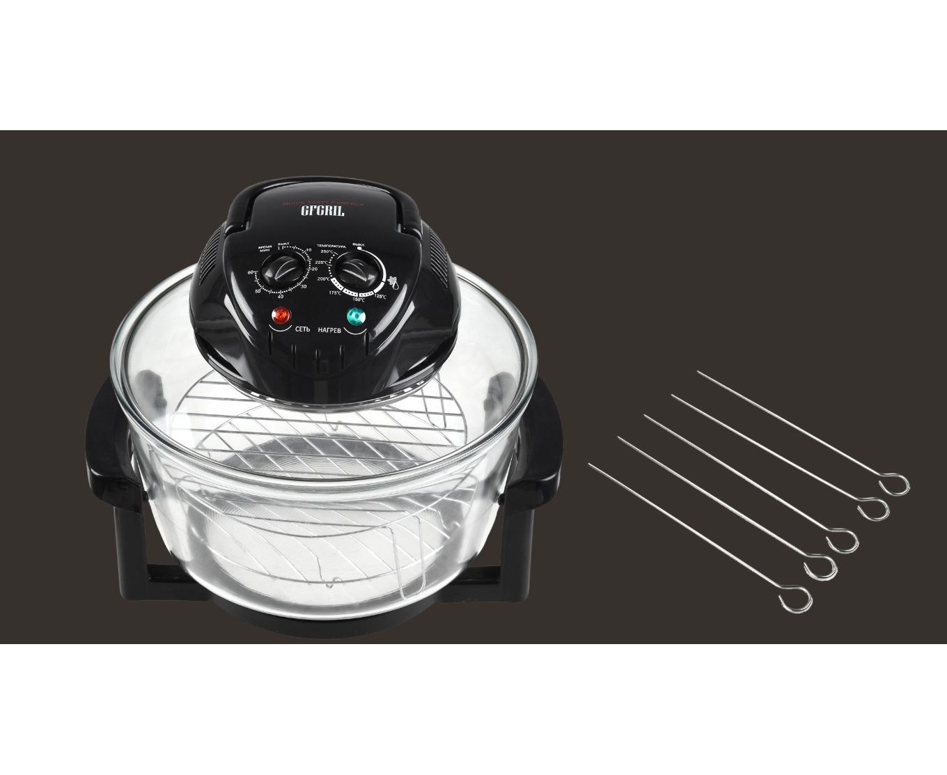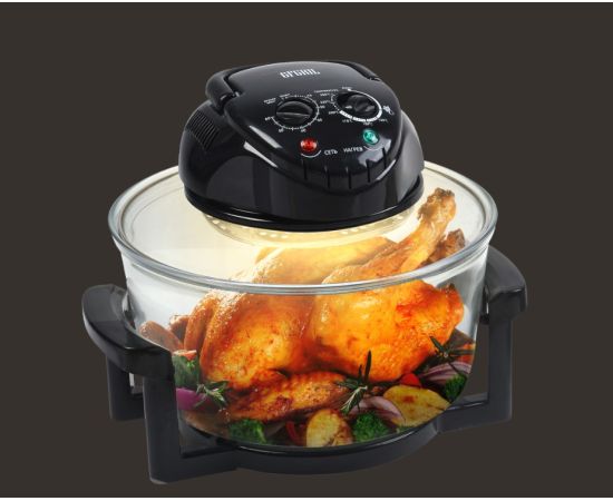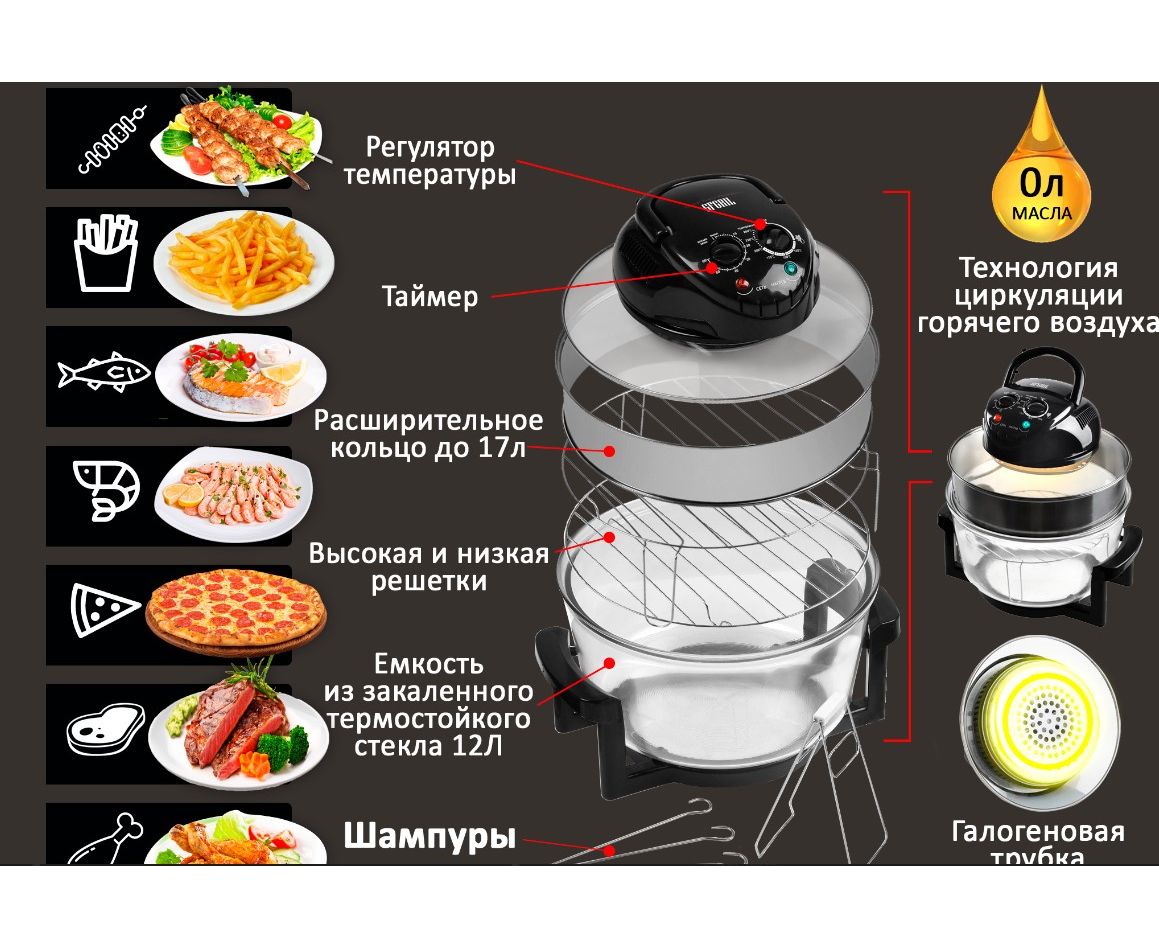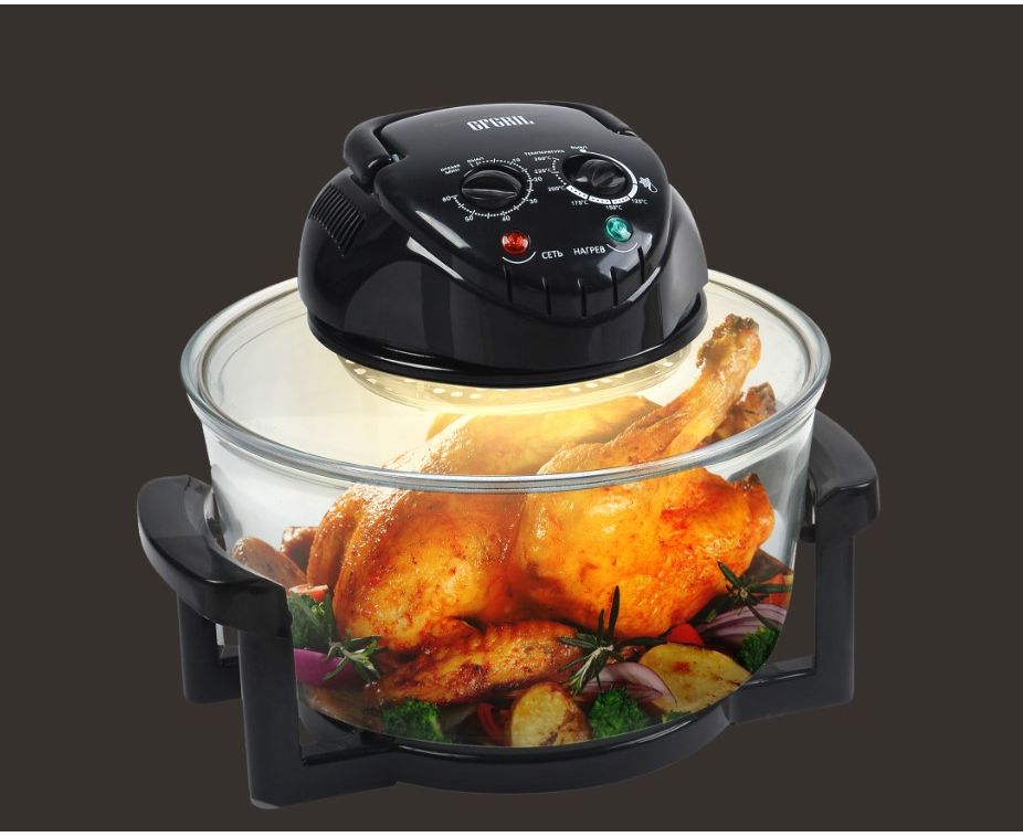 Галогенный нагревательный элемент и мощный вентилятор обеспечивают циркуляцию воздуха по всему объему чаши.