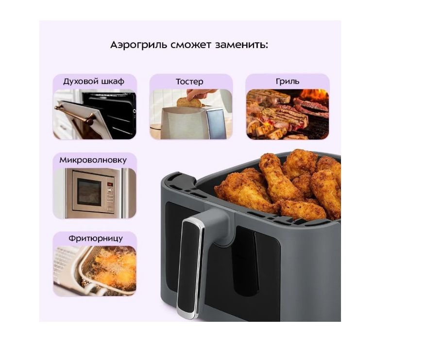 Он оснащён электронным управлением и имеет 9 автоматических программ, которые имеют свою температуру приготовления. Время готовки задаётся автоматически, исходя из веса продуктов. У аэрогриля есть таймер для более удобного использования.