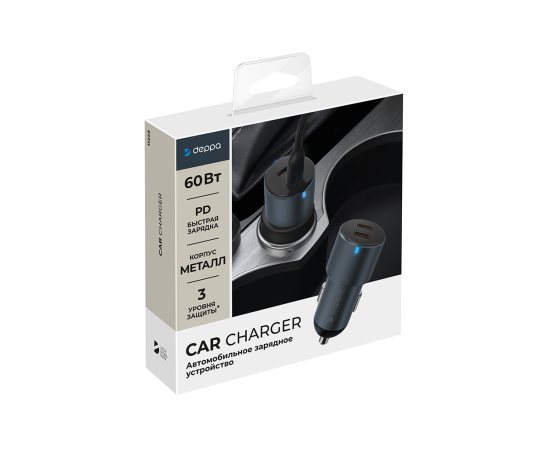 AЗУ 2xUSB-C, PD, 60W, металл, серый, Deppa