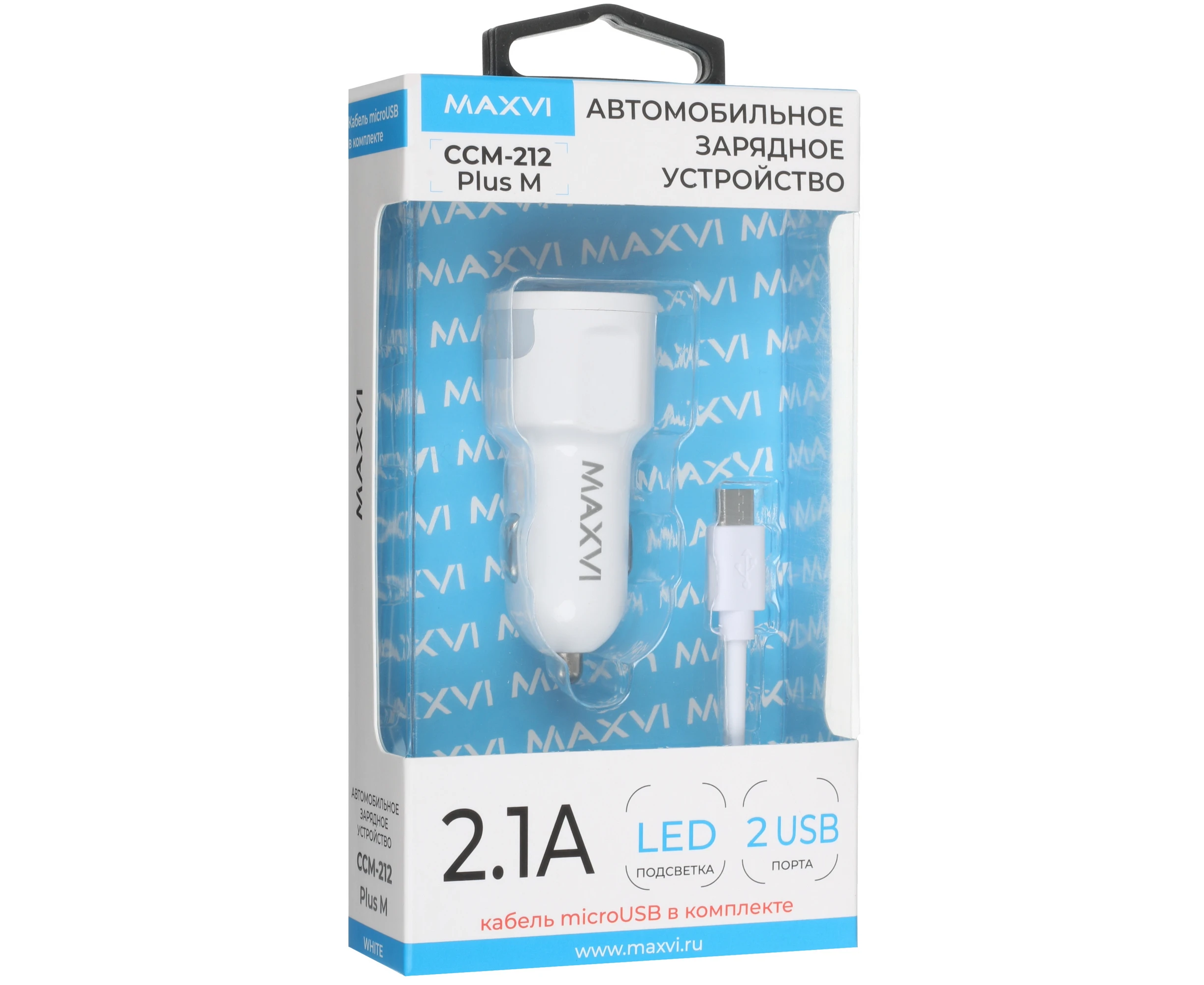 АЗУ Maxvi CCM-212 Plus M white 2.1A, 2xUSB, microUSB подсветка синяя
