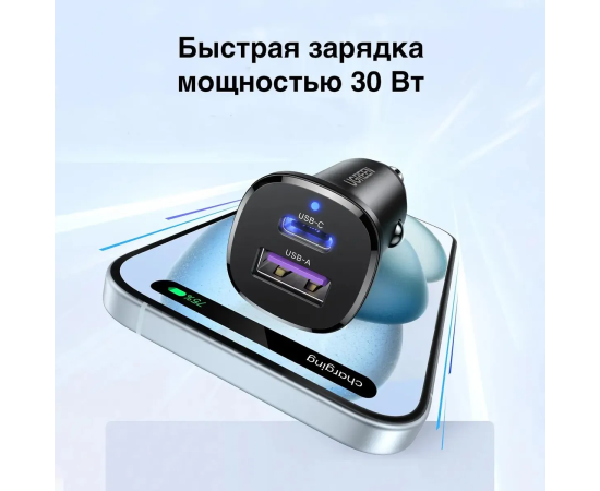 АЗУ UGREEN EC305 (25845) USB-C PD+USB-A QC 30W Fast Car Charger with PC Case Black