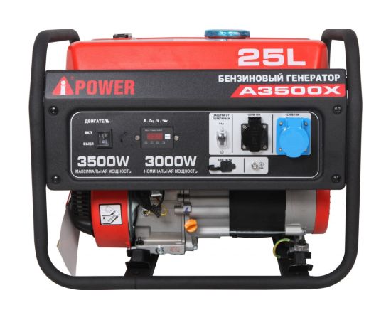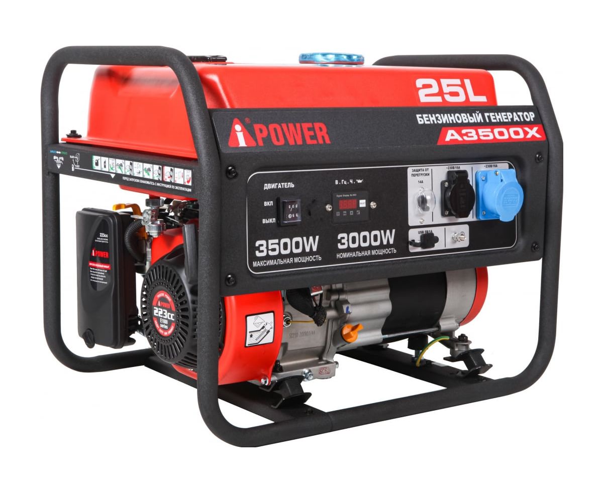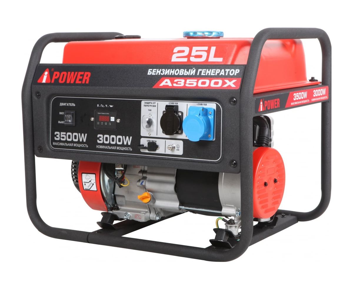 Бензиновый генератор A-iPower A3500X 20104 - отличное решения для населенных пунктов, где часто отключают электрическую энергию. Также эта станция подходит для питания дачных домиков. Модель уникальна, так как может выдержать 7,4 кВа пусковой мощности, что делает ее подходящей для подключения техники, требующей высоких пиковых значений мощности. Генератор оборудован автоматом защиты, предотвращающим поломку техники при перегрузке. A-iPower A3500X оснащен компактным гильзованным 4-тактный OHV-двигателем объемом 223 куб. см с ручным стартером. На панели управления находится одна стандартная розетка 230В/16А, одна силовая розетка 230В/16А, и разъем USB, от которого можно подзарядить смартфон, планшет и другие гаджеты. На цифровой дисплей в режиме реального времени выводятся сведения о работе генератора.