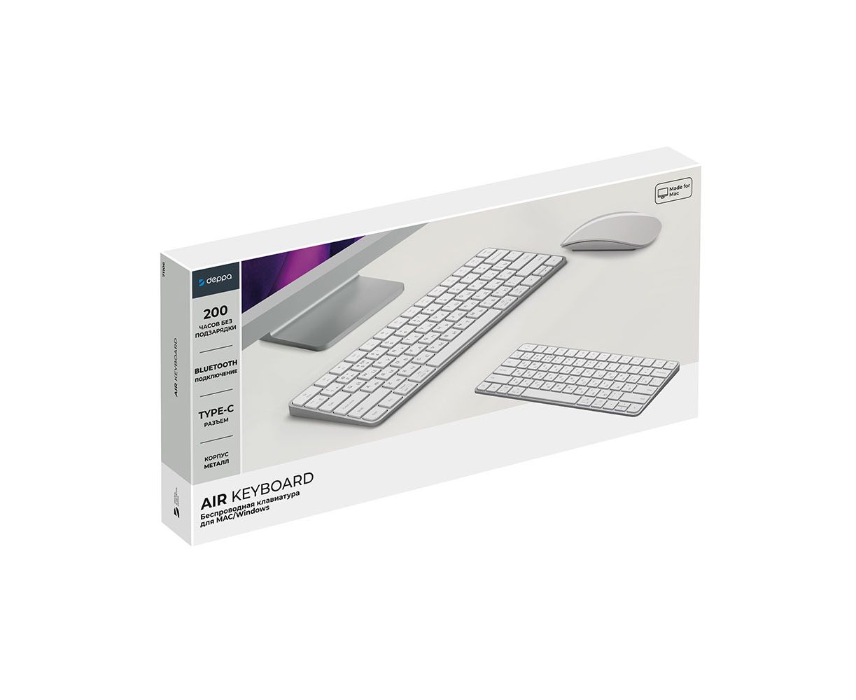 Беспроводная клавиатура Air Keyboard для MAC, Windows, 500 мАч, алюминий, белый, Deppa