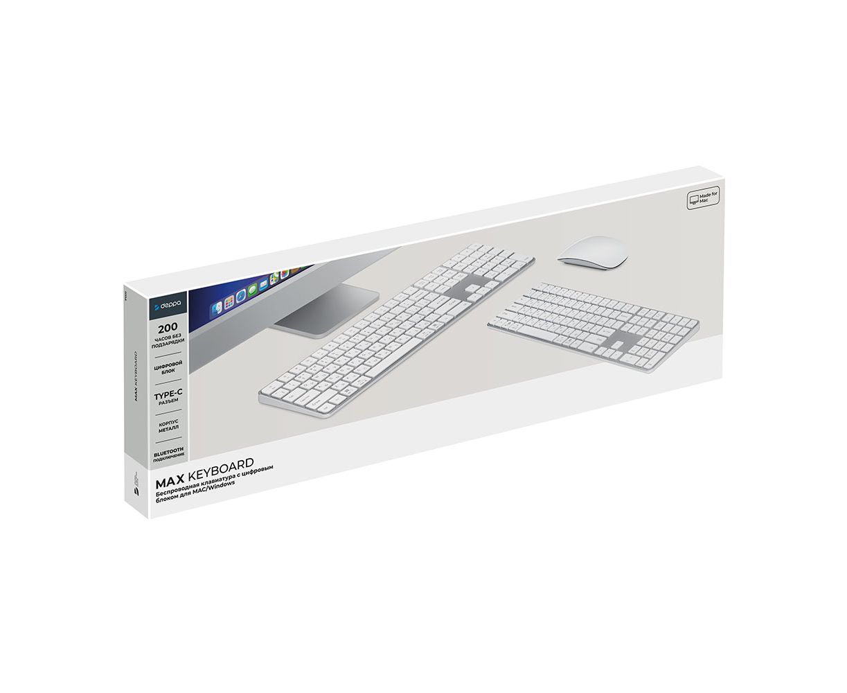 Беспроводная клавиатура c цифровым блоком Max Keyboard для MAC, Windows, алюминий, белый, Deppa