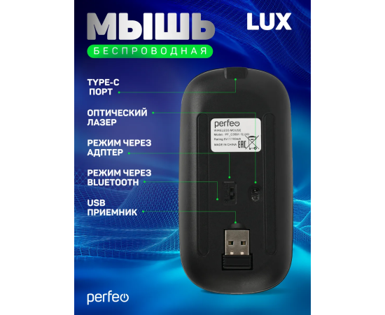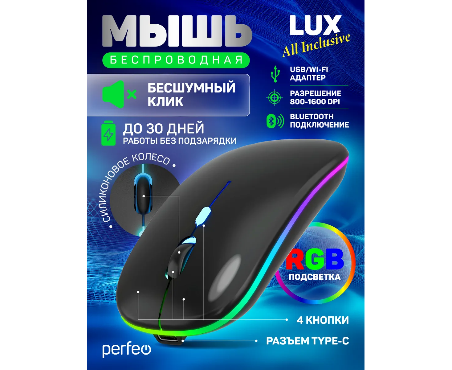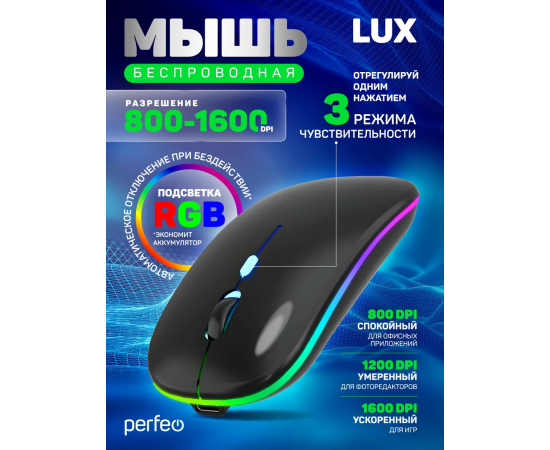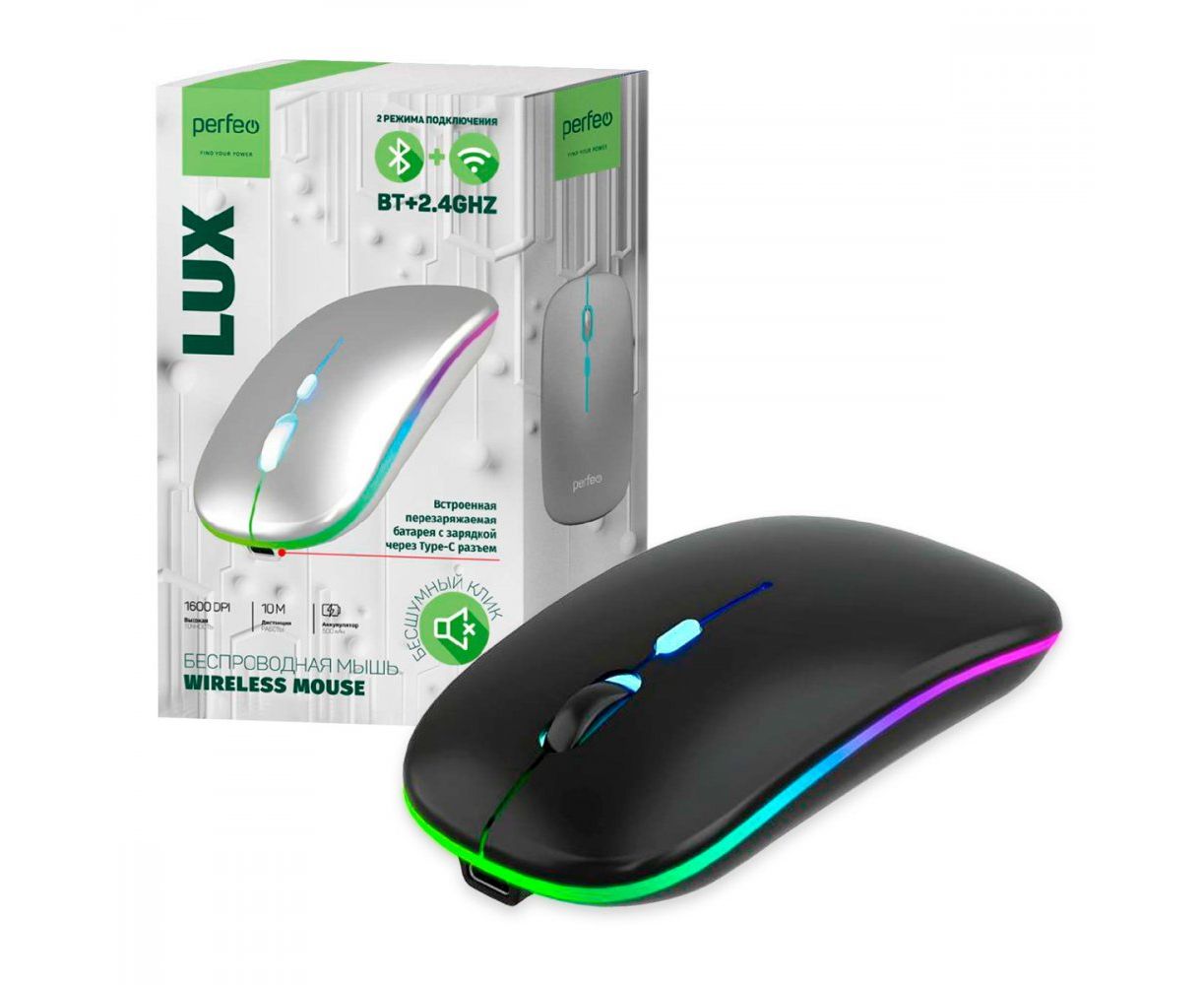 Беспроводная мышь Perfeo, оптич. "LUX", 4 кн, подкл 2.4G+BT, аккум 500mAh, type-C, подсв, бесшумн, 1600DPI, чёрный