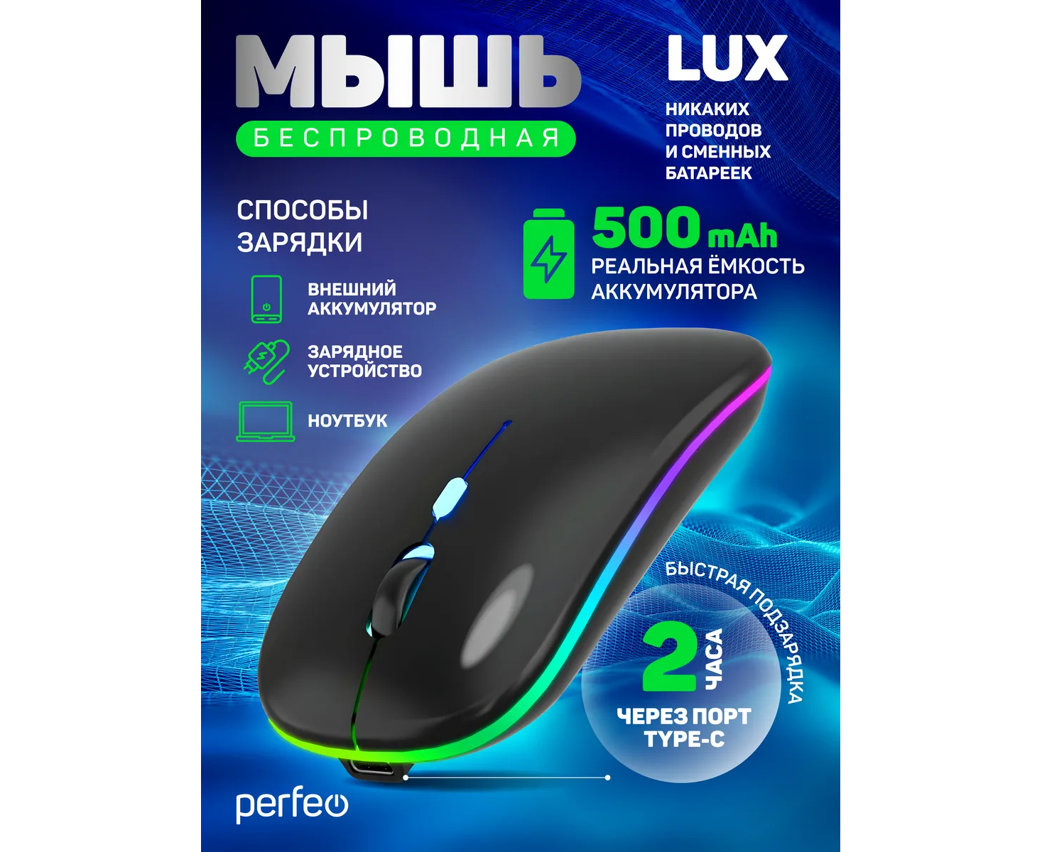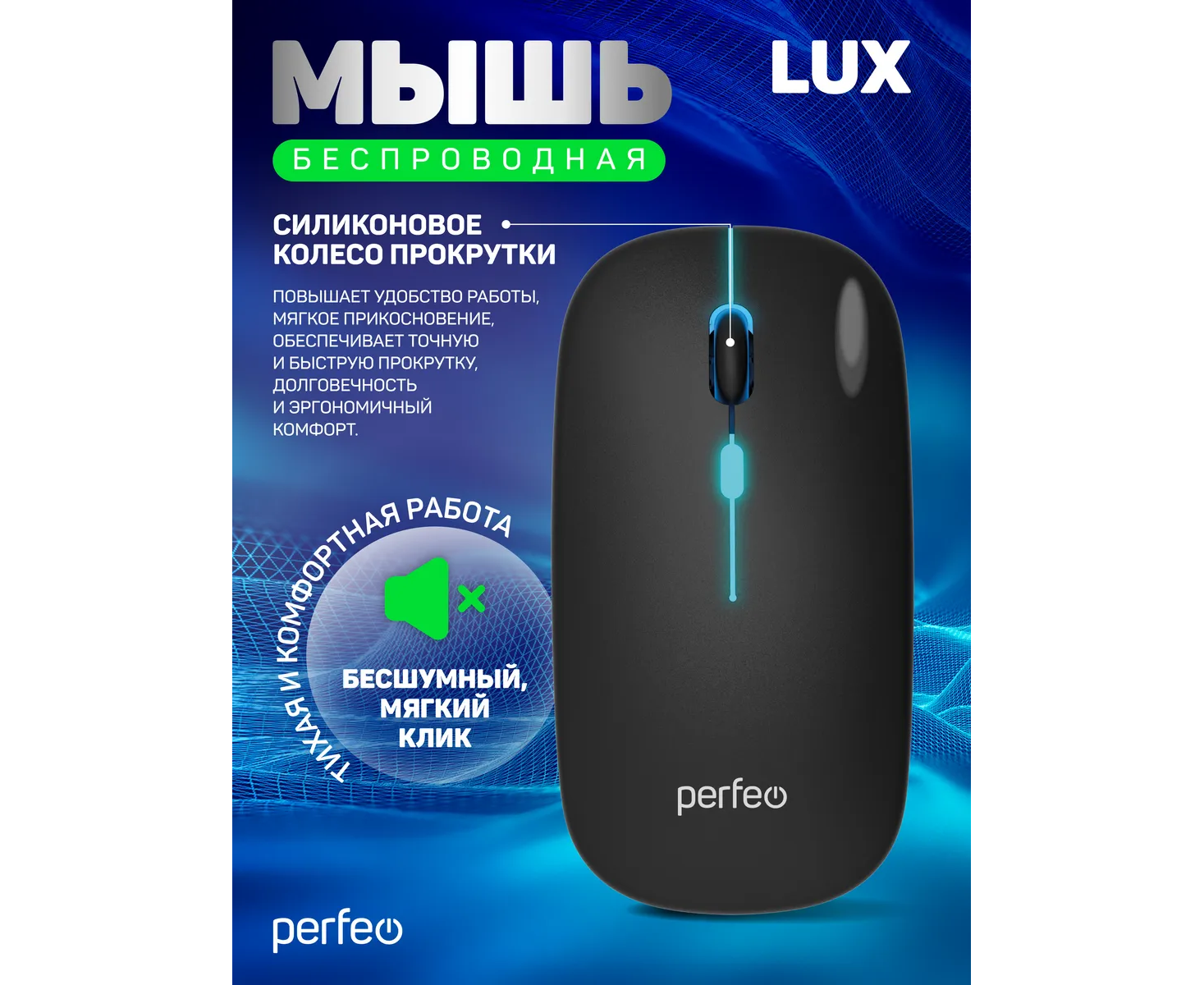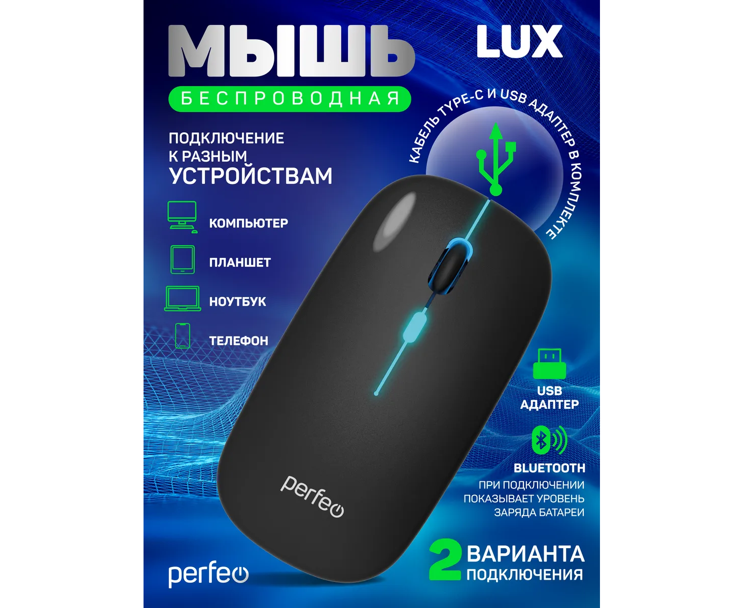 Беспроводная мышь Perfeo, оптич. "LUX", 4 кн, подкл 2.4G+BT, аккум 500mAh, type-C, подсв, бесшумн, 1600DPI, чёрный