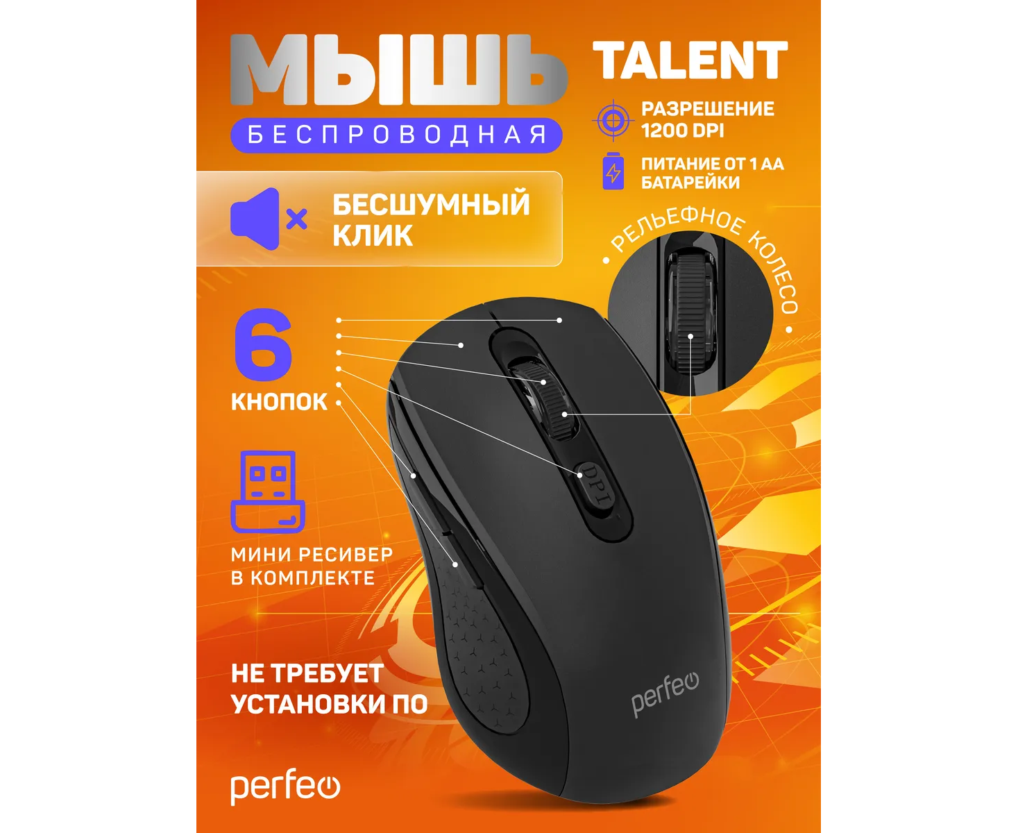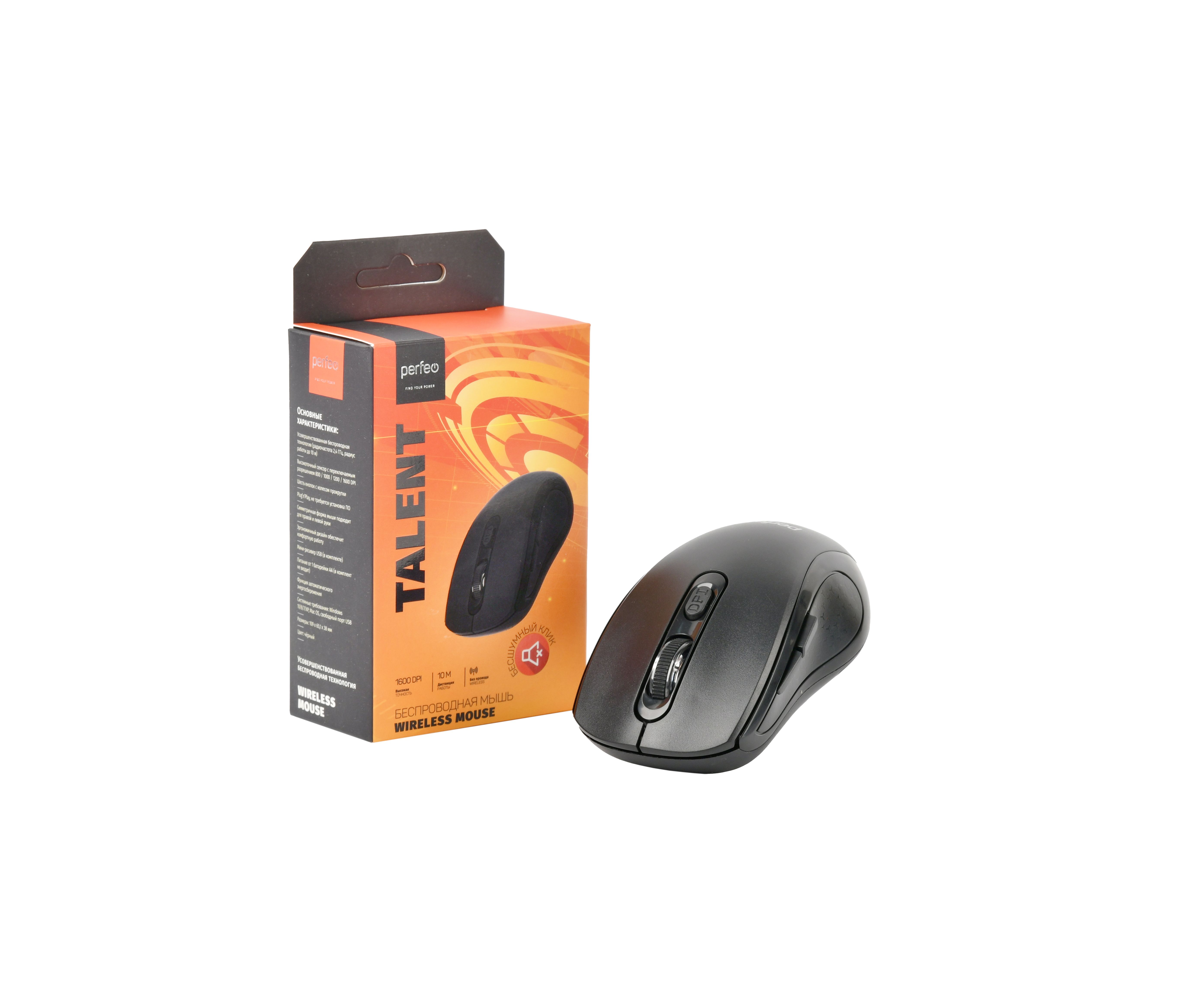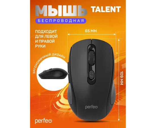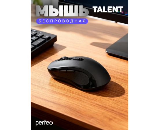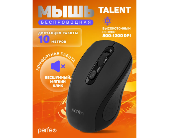 Модель Perfeo мышь беспров., оптич. "TALENT", бесшумная, 6 кн, 800-1600 DPI, USB, чёрн.