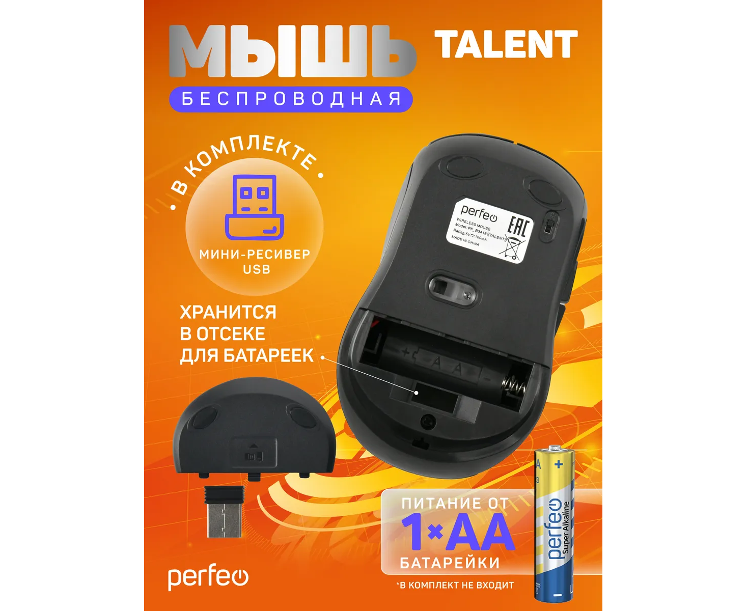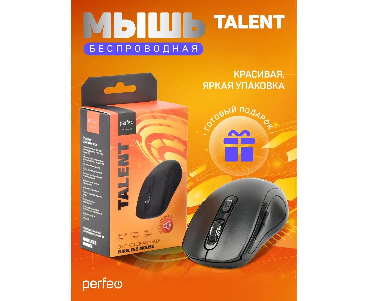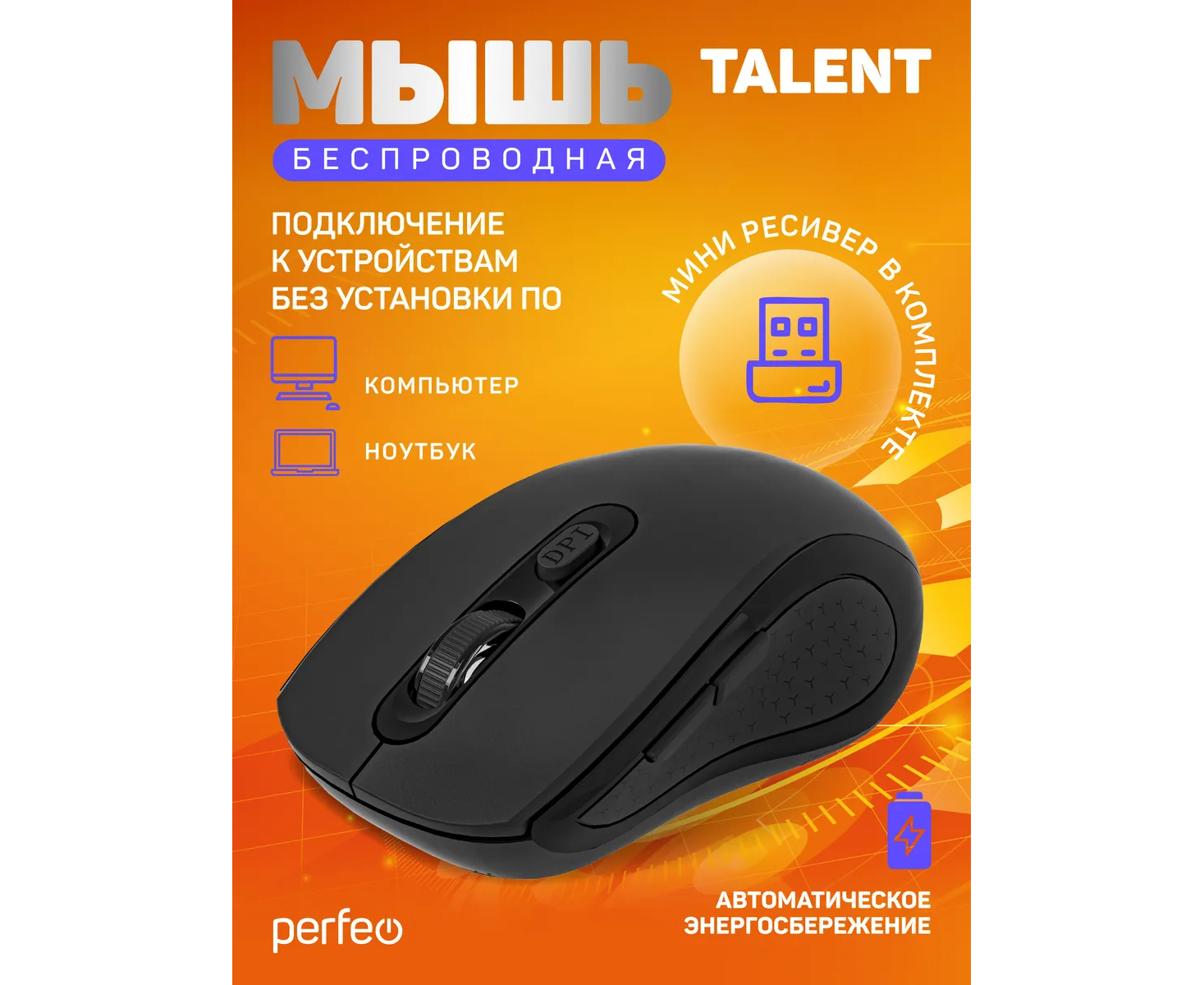 Модель Perfeo мышь беспров., оптич. "TALENT", бесшумная, 6 кн, 800-1600 DPI, USB, чёрн.