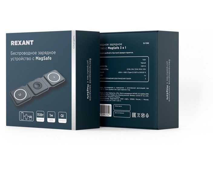 Беспроводное зарядное устройство REXANT 18-7088 с MagSafe 3в1, Qi, 15Вт, черный