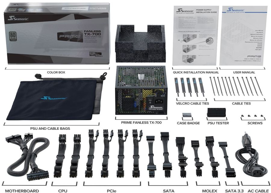 ATX; мощность: 700Вт; активный PFC; стандарт 80 PLUS TITANIUM; питание MB и CPU: 24+2x(4+4) pin; питание видеокарты: 4х(6+2) pin; разъемы Molex: 5шт; разъемы SATA: 10шт; отсоединяющиеся кабели; безвентиляторный, цвет: черный; тип поставки Ret