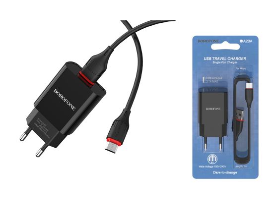 Блок питания сетевой 1 USB Borofone, BA20A, Sharp, 2100mA, пластик, кабель микро USB, цвет: чёрный (1/48/192)