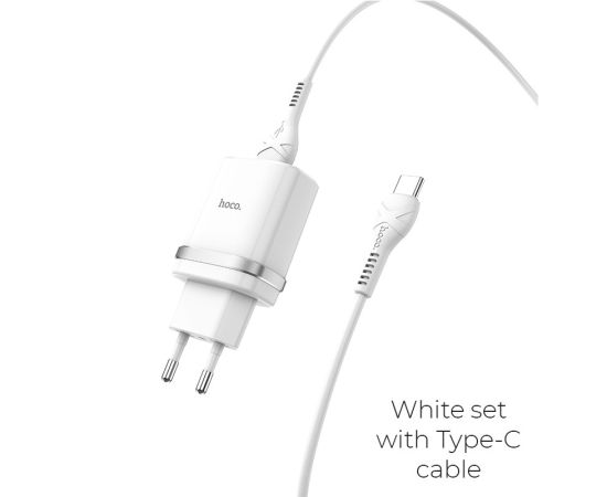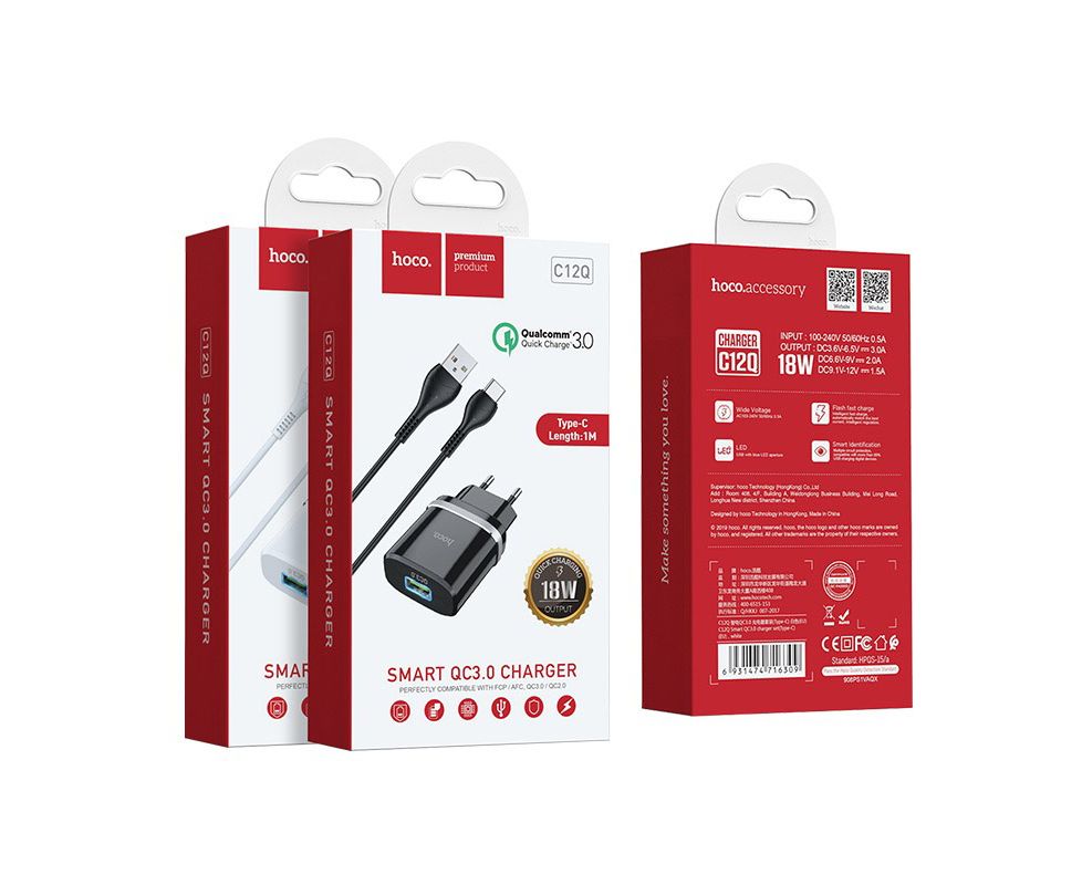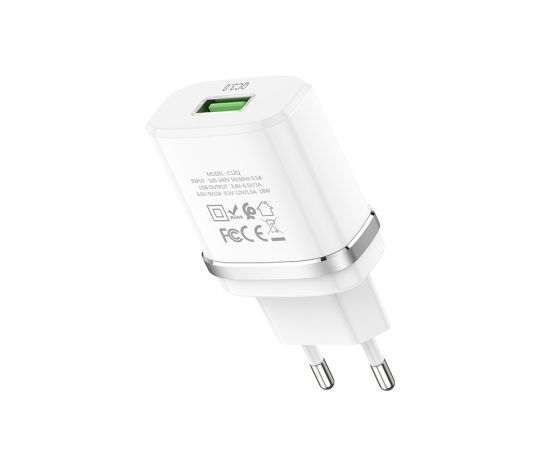 Блок питания сетевой 1 USB HOCO C12Q, 3000mA, пластик, QC3.0, кабель Type-C, цвет: белый(1/10/100)