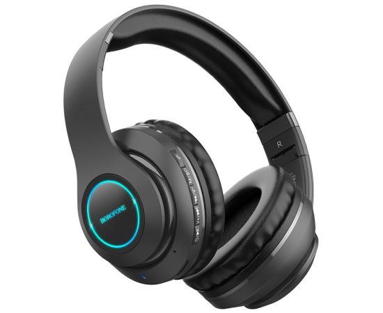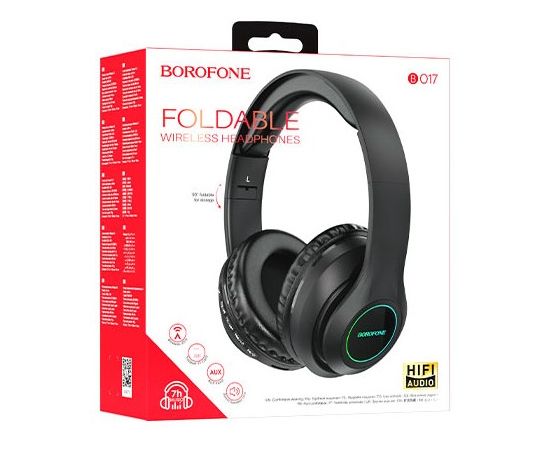 Borofone BO17 - беспроводные накладные наушники, поддерживают стандарт BT 5.0, емкость аккумулятора 400mAh, хватает на 7 часов в режиме разговора и воспроизведения музыки, время зарядки - 2.5 часа. Наушники поддерживают воспроизведение музыки через кабель AUX, с карты памяти TF и по Bluetooth. Голосовые уведомления на китайском и английском языках: дважды нажмите кнопку M в режиме без сопряжения. 5 кнопок управления на корпусе наушника. Размеры: 177х166х78мм. Вес: 193г.