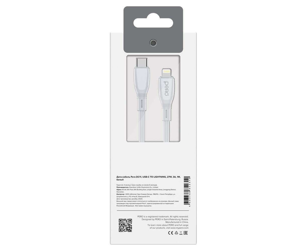Дата-кабель PERO DC11 PD Type-C to Lightning, 27W, 3m, White