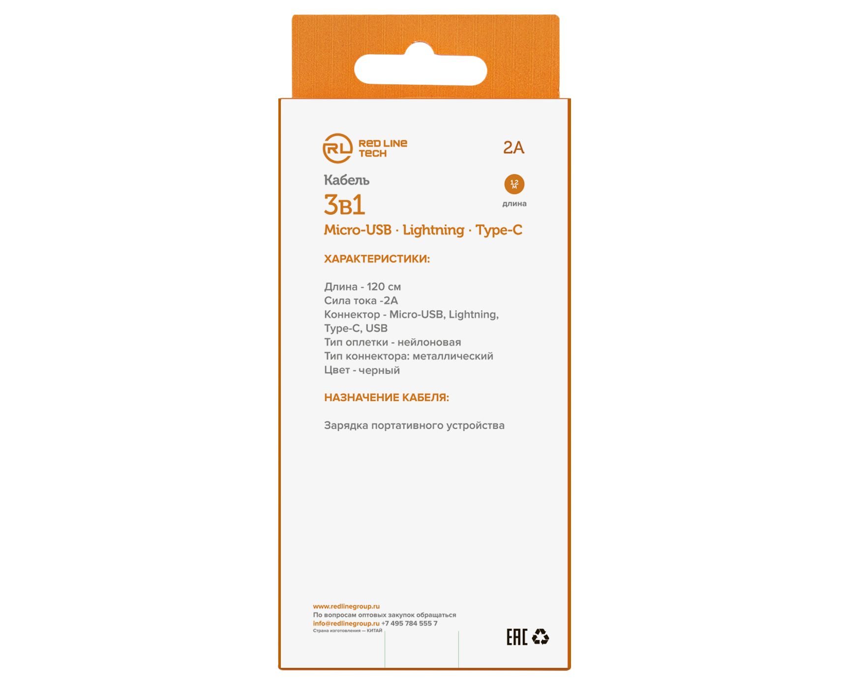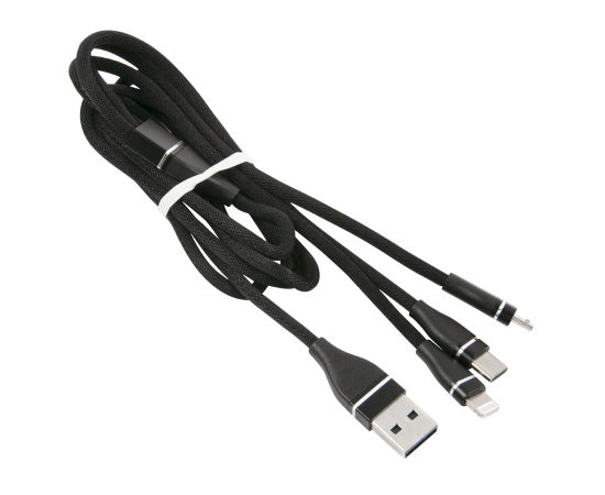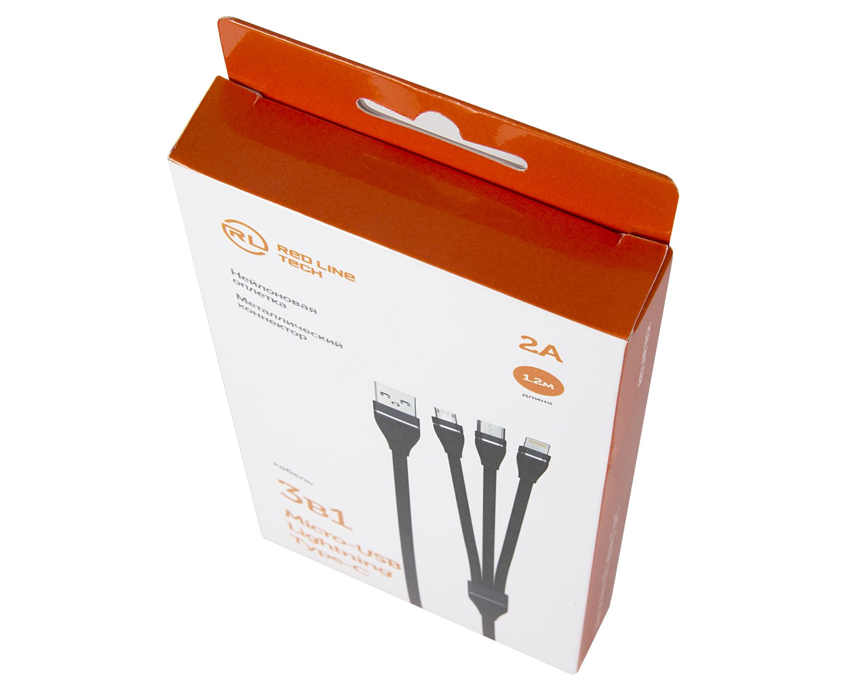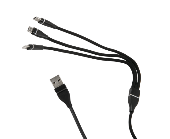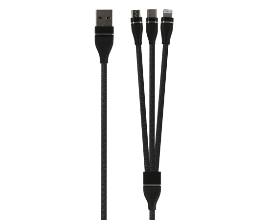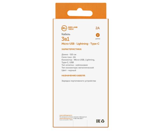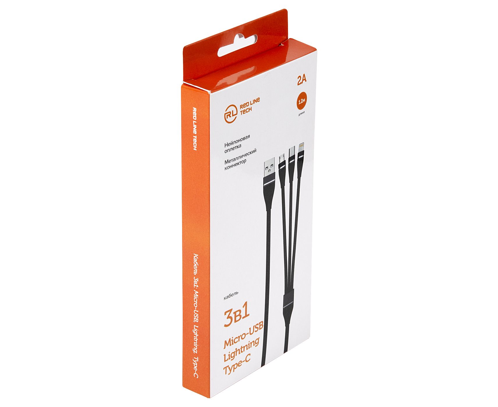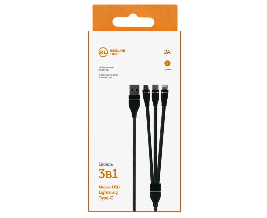 Дата-кабель Red Line 3в1, USB - microUSB+Lightning+Type-C, 2A, нейлон. оплетка, черный