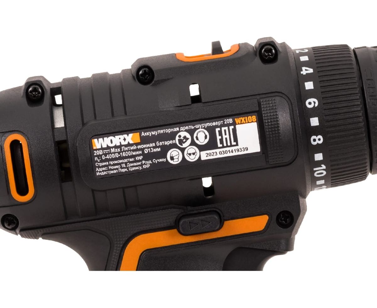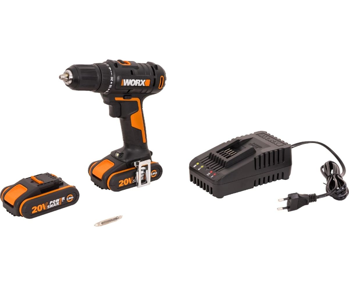 Дрель-шуруповерт WORX WX108 аккумуляторная, 50Нм, 20В, 2Ач x2, ЗУ 2А, кейс