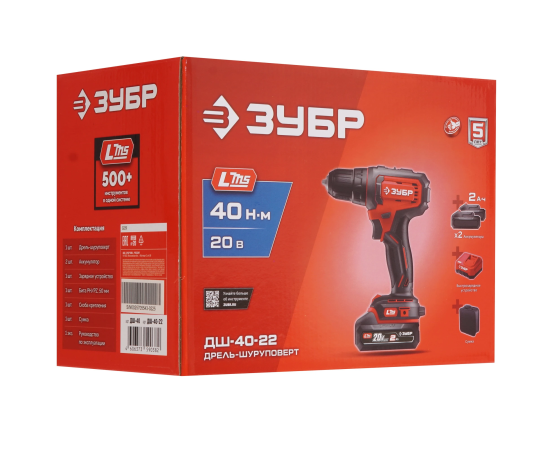 ЗУБР 20 В, 40 Н·м, 2 АКБ LMS (2 А·ч), дрель-шуруповерт, сумка ДШ-40-22 - инструмент из единой аккумуляторной системы LMS для 500+ инструментов.