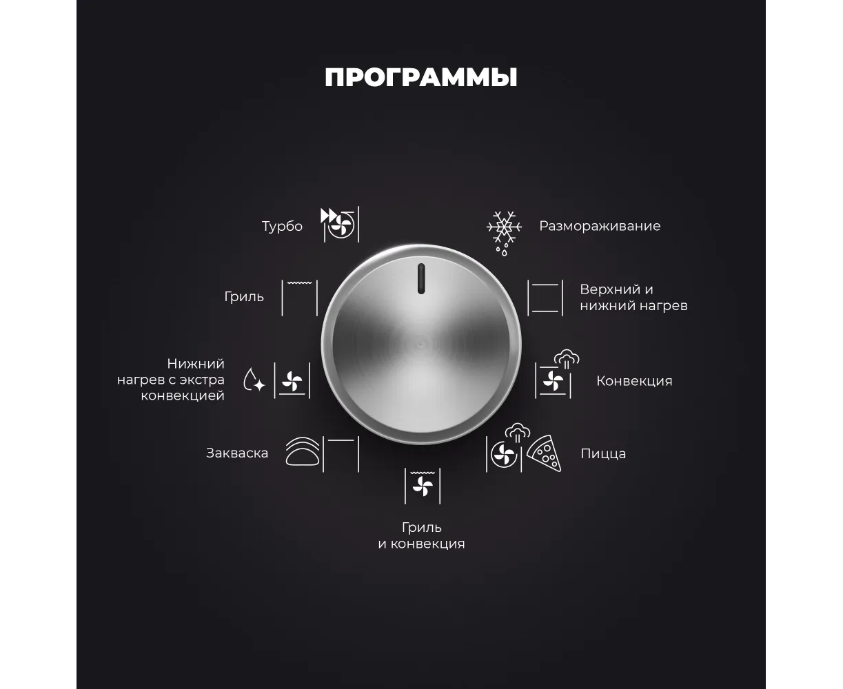 Режимы работы: Конвекция, Гриль, Размораживание, Турбо режим, Нижний нагрев, Верхний нагрев + конвекция, Нижний нагрев + конвекция, Гриль + конвекция, Нижний нагрев + Турбо (Пицца)