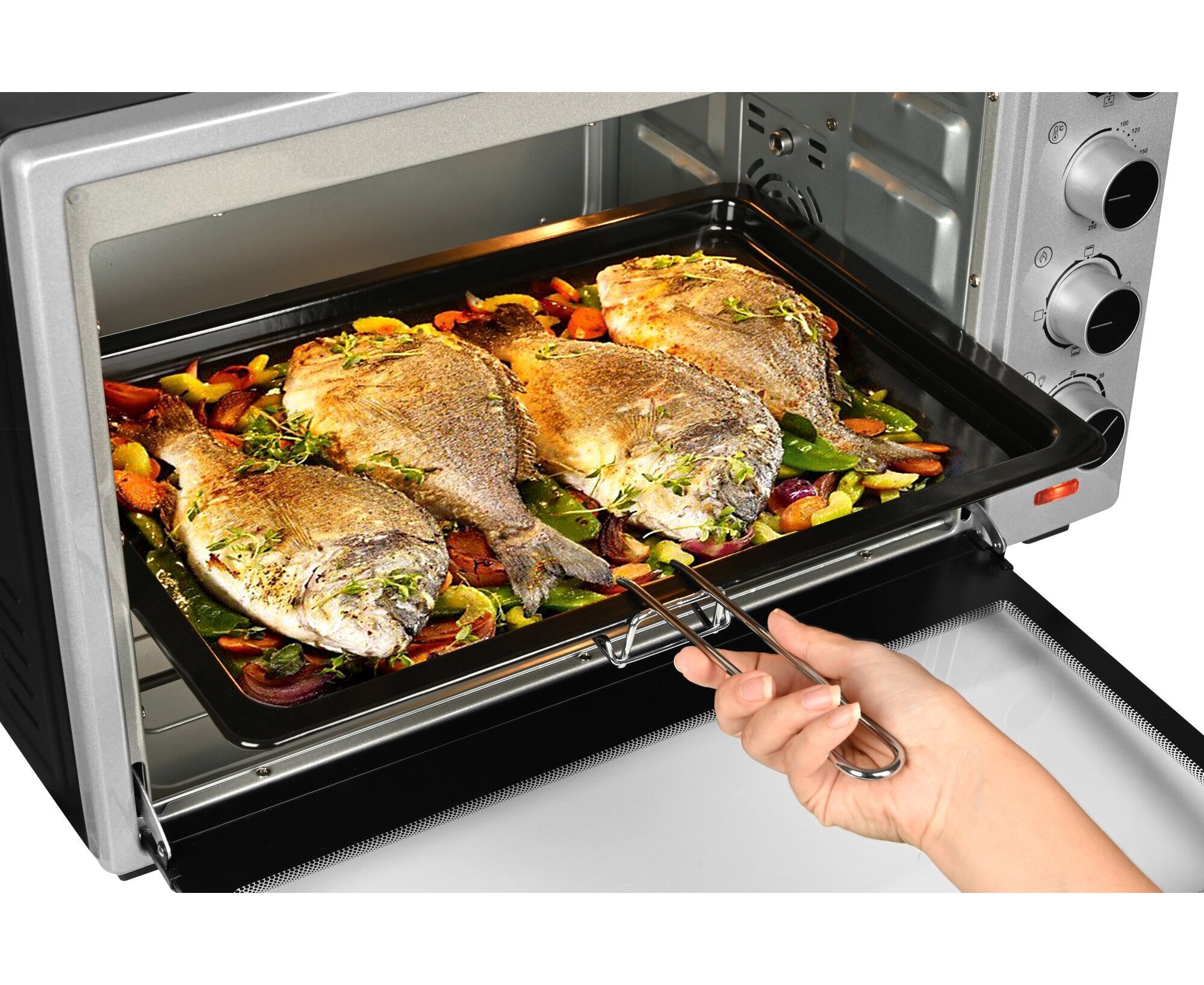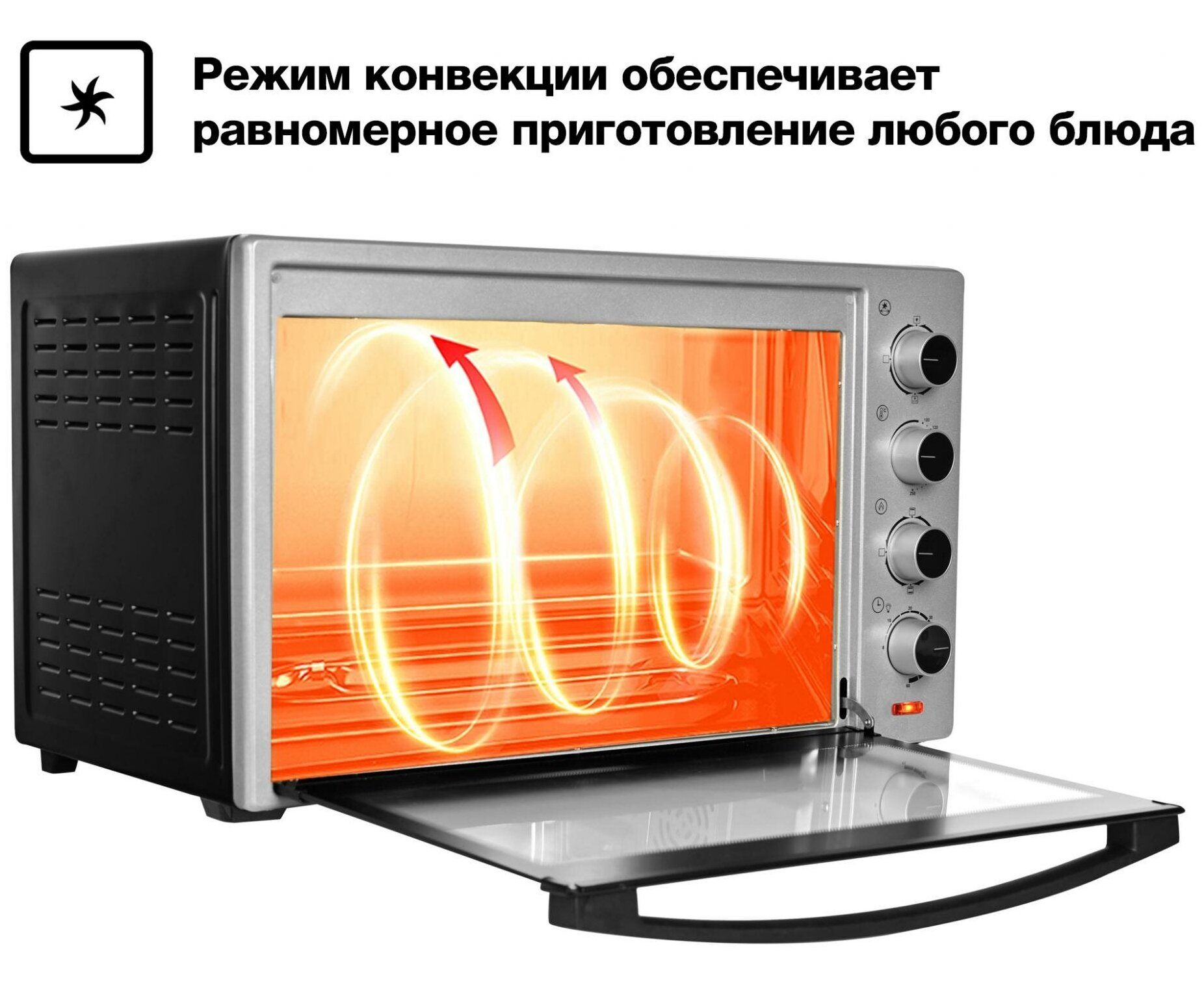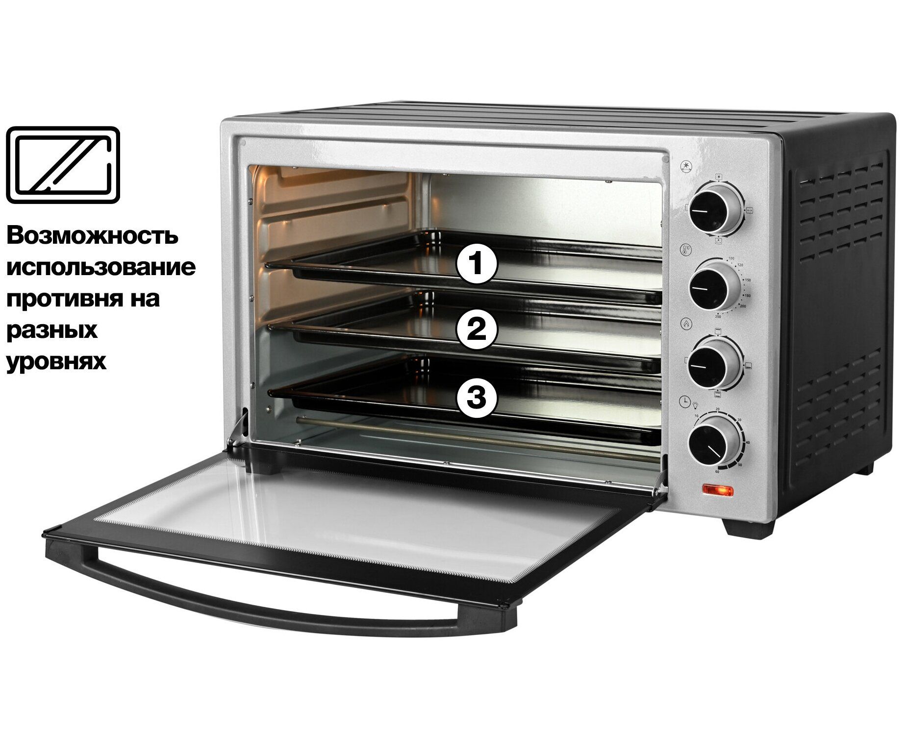 Управление — механическое. Таймер выключит модель в назначенное время и оповестит об окончании работы звуковым сигналом. Световые индикаторы показывают текущую и заданную температуру внутри. Подсветка позволяет отслеживать процесс приготовления, не открывая дверцу.