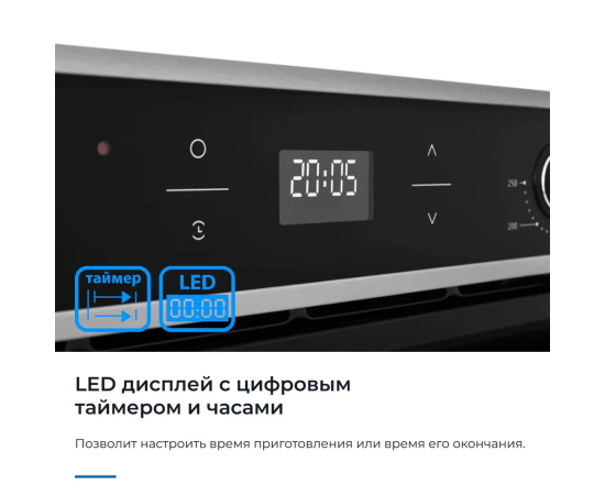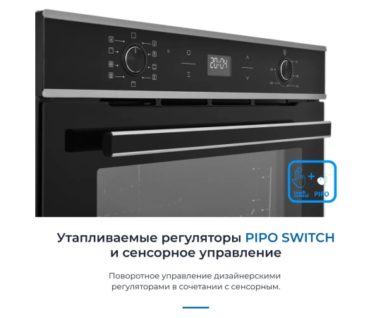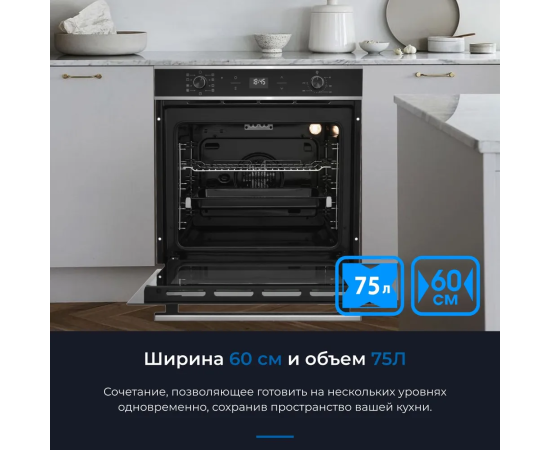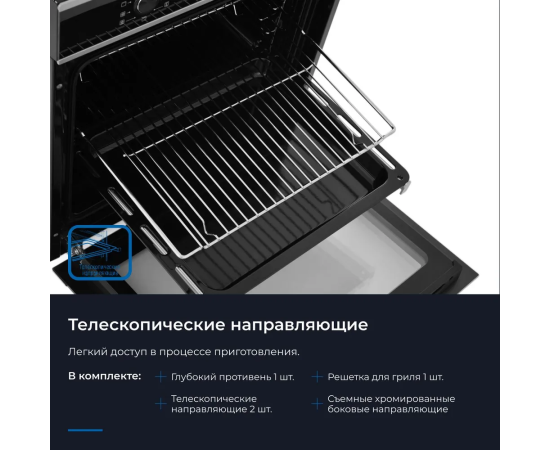 Особенности духовки, плиты: Хромированные направляющие, Вентилятор охлаждения, Дисплей, Встроенные часы, Двухуровневое приготовление, Доводчик дверцы духовки