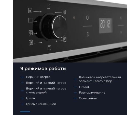 Режимы работы: Гриль + конвекция, Верхний + нижний нагрев, Верхний нагрев, Нижний нагрев + Турбо (Пицца), Кольцевой элемент + вентилятор + выпариватель, Размораживание, Гриль