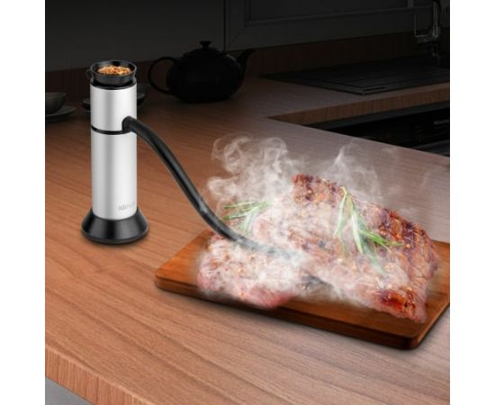Пригоден для использования в помещении - дымогенератор устойчиво стоит на столе, а эластичная коптильная трубка длиной 25 см позволяет окуривать продукты в любой посуде