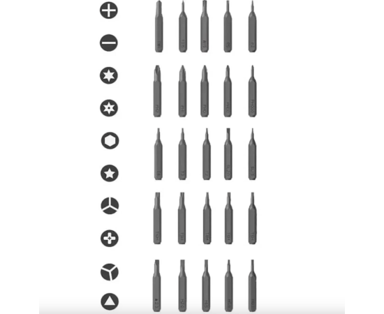 В наборе находятся 25 бит – PH000, PH00, PH0, PH1, PH2, SL1.5, SL2.0, H0.7, H0.9, H1.5, H2.0, T2, T3, T4, T5H, T6H, T8H, T9H,Y10H,P2, P5, Y0.6, W1.5, TW1, 2.2. электрическая отвёртка
