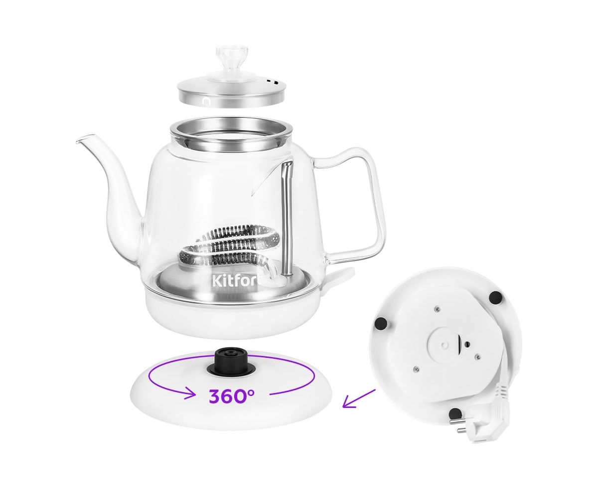 Подставка с центральным контактом дает возможность располагать на ней чайник в любом положении, обеспечивая вращение на 360°. Снизу имеется отсек для хранения шнура, в который можно смотать излишки шнура электропитания, чтобы он не мешал на столе.