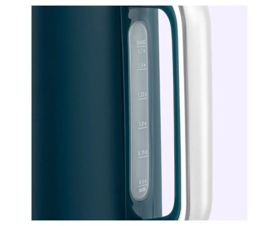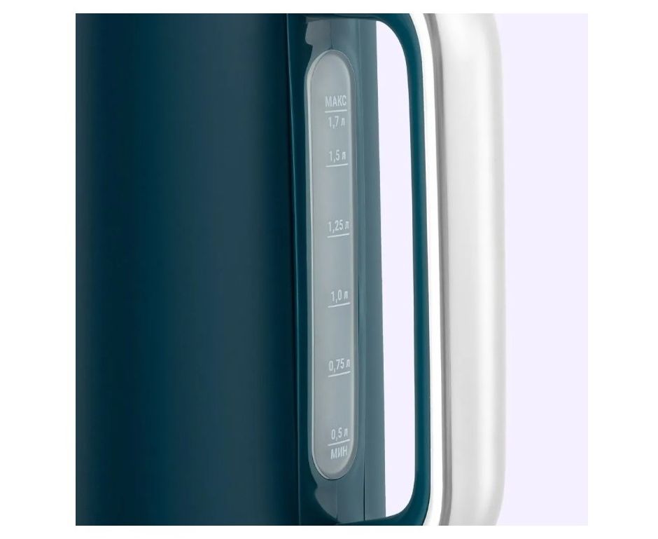 Пластиковая ручка чайника не нагревается и удобно лежит в руке. На прозрачной части корпуса под ручкой расположена мерная шкала с отметками минимального и максимального уровня воды для удобного контроля наполнения.