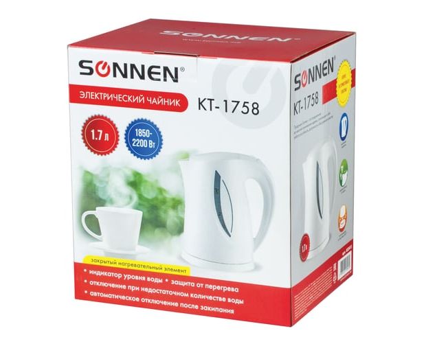 Чайник SONNEN KT-1758 1.7 л, 2200 Вт, закрытый нагревательный элемент, пластик, белый 453415 предназначен для использования дома или в офисе.