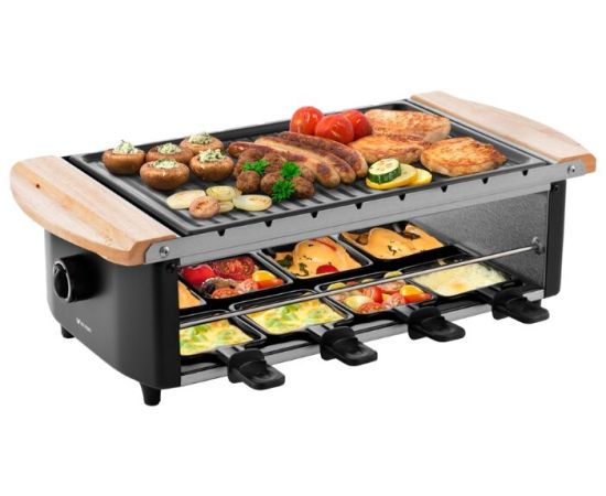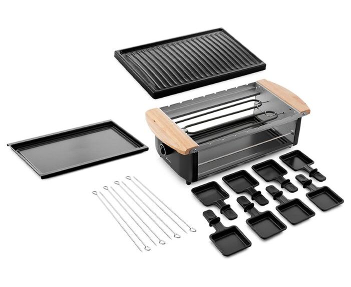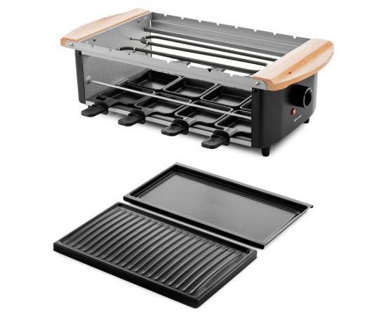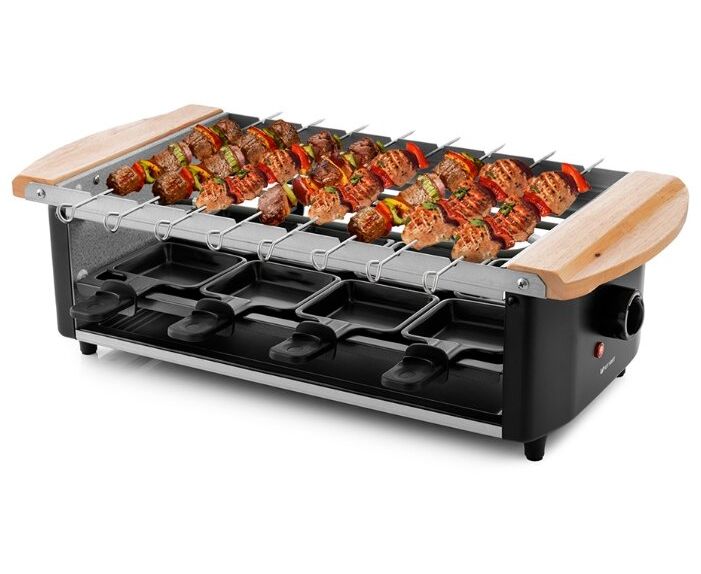 В общем и целом отличная раклетница, соответствующая своей ценовой категории. На нижнем ярусе в сковородочках сыр плавится достаточно медленно. Но на гриль панели вполне можно поджаривать грибы, мясо и овощи. Отлично получаются бекон и шампиньоны. На компанию из 8 человек вполне хватает места. В процессе работы нагревается, так что лучше чем-то изолировать от нежаростойких поверхностей. Из недостатков только малая мощность - достаточно медленно всё жарится, но и цена соответствующая. И хотелось бы в комплекте видеть лопатки. Не удалось отдельно найти в продаже специальные лопатки для раклетницы, так что приобрели обычные кухонные силиконовые, укороченного размера (около 18 см длиной).