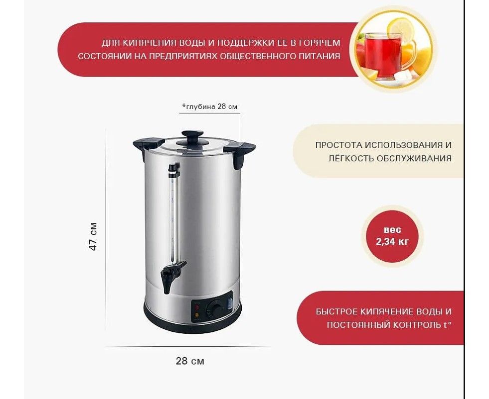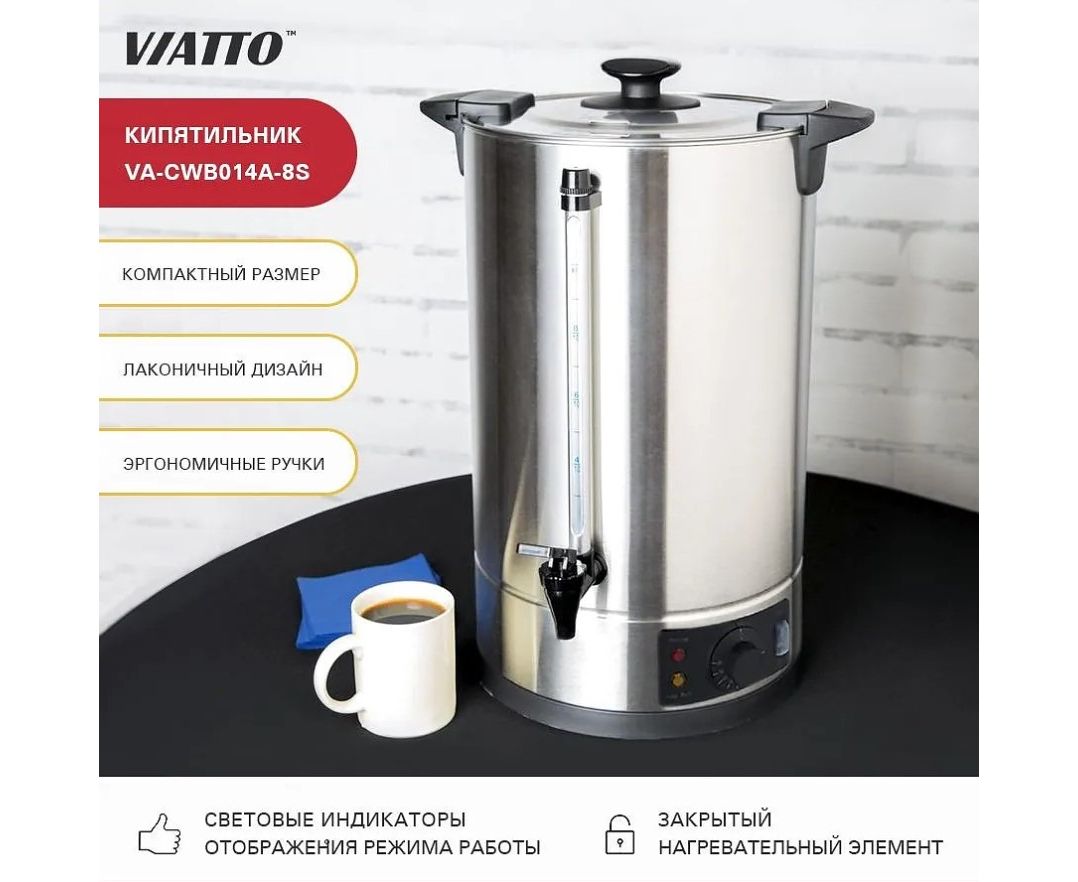 Настольный заливной электрокипятильник VIATTO VA-СWB014A-8S предназначен для автоматического подогрева питьевой воды до 100 °C на предприятиях общественного питания и торговли, а также в дошкольных, общеобразовательных и медико-санитарных учреждениях. Модель оснащена закрытым нагревательным элементом, защитой от «сухого хода», терморегулятором и мерным стеклом. Одинарные стенки выполнены из нержавеющей стали AISI 304.