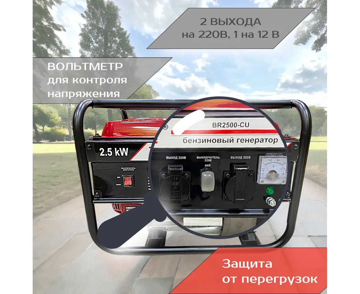 BR2500-CU оснащен четырехтактным бензиновым двигателем, работающем на АИ-92 бензине. Он обладает мощностью 5,5лс и имеет воздушное охлаждение. Емкость бака для топлива - 15л. Полной заправки будет достаточно на девять часов беспрерывной работы при среднем уровне загрузки. На корпусе генератора размещены две обычные розетки 32А и 16А. Медная обмотка увеличивает срок службы генератора. контролировать напряжение можно посредством простого вольтметра, находящегося на передней панели корпуса.