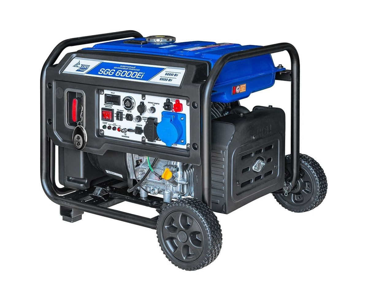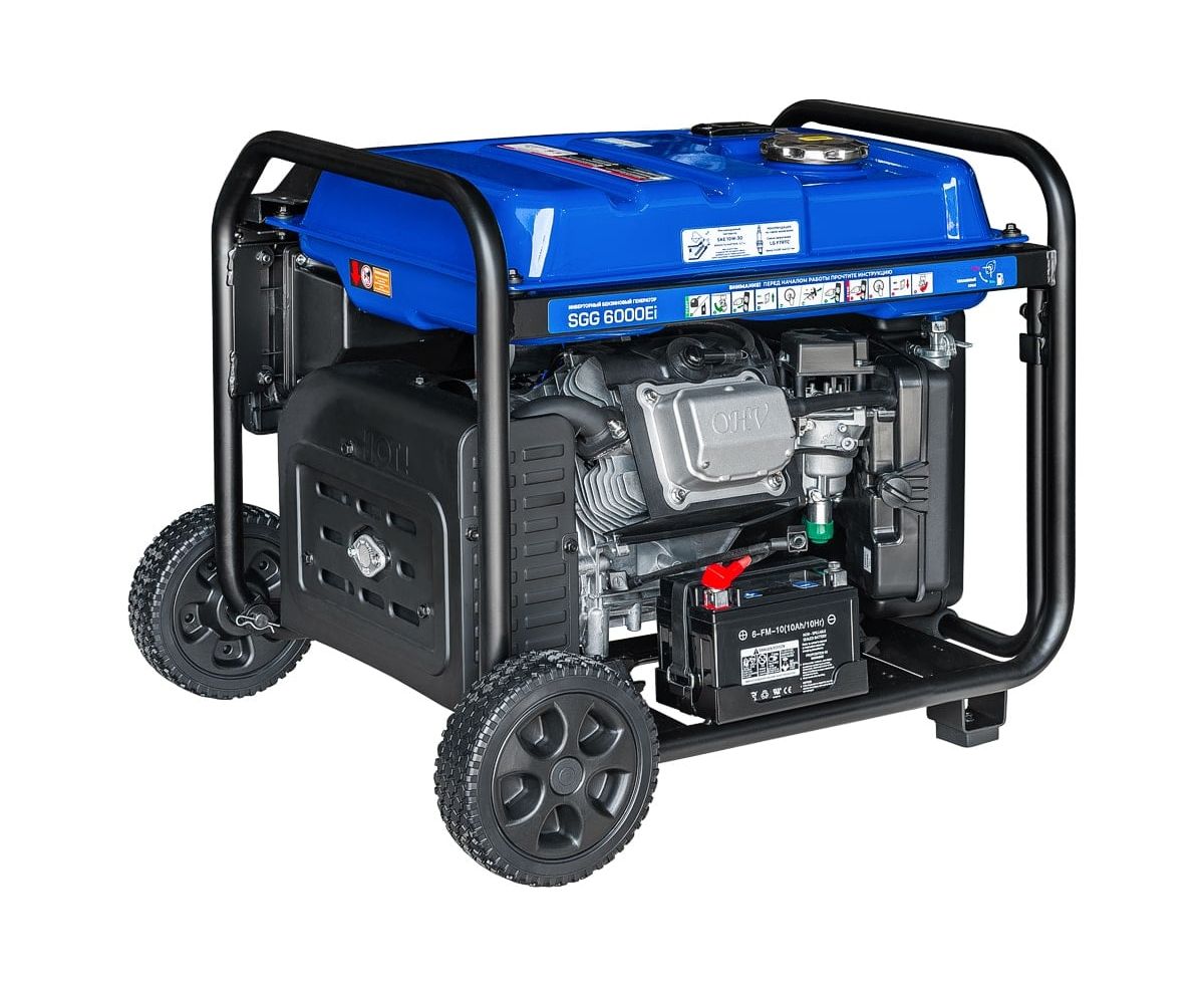 Бензогенератор инверторный SGG 6000Ei с электростартом, коннектором для подключения АВР, укомплектован колёсным комплектом для удобства перемещения.