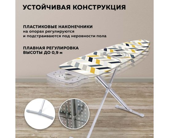 Доску можно регулировать по высоте. В конструкции предусмотрена откидная полка для белья и переносной подрукавник.