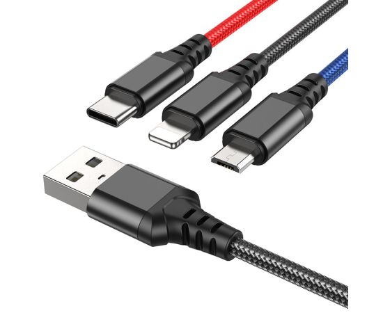 Кабель 3-in-1 HOCO X76/ USB: Lightning+Micro+Type-C/ 1m/ 2A/ Черный+Красный+Синий