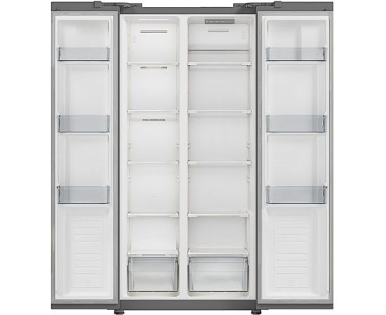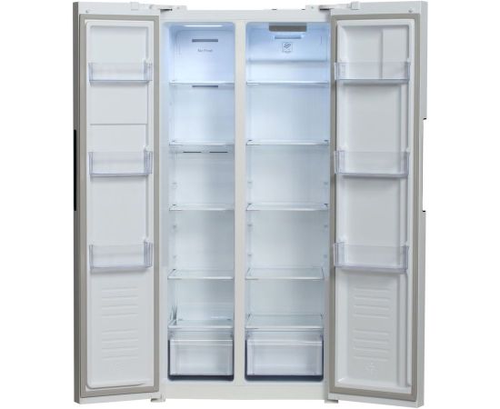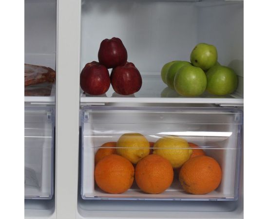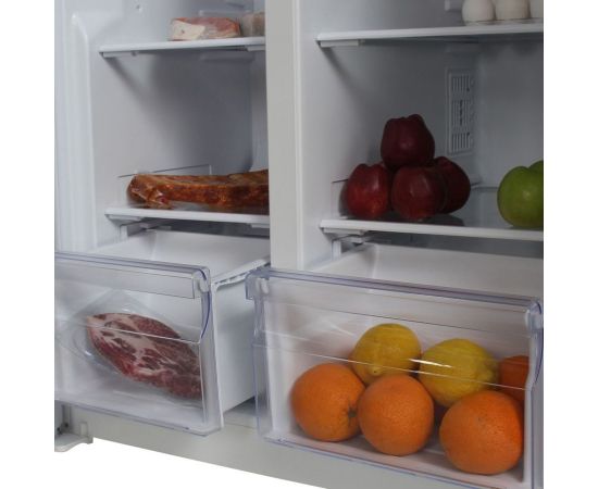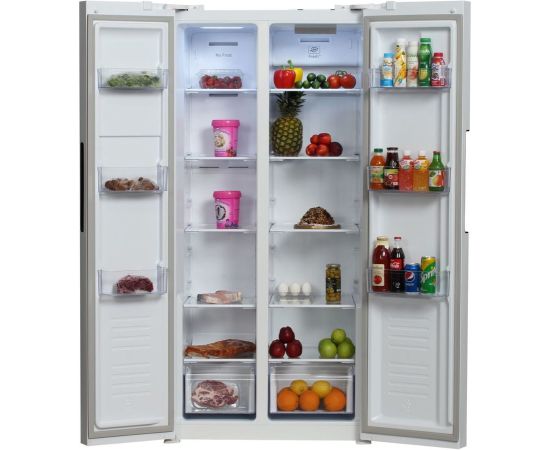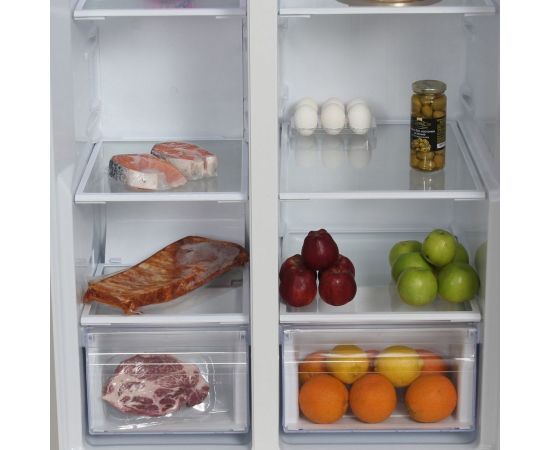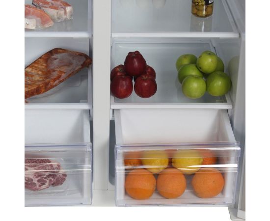 количество камер: двухкамерный; расположение морозильной камеры- сбоку (Side by Side), размораживание морозильной камеры- Total No Frost, общий объем 476л, защита от детей, цвет: белый
