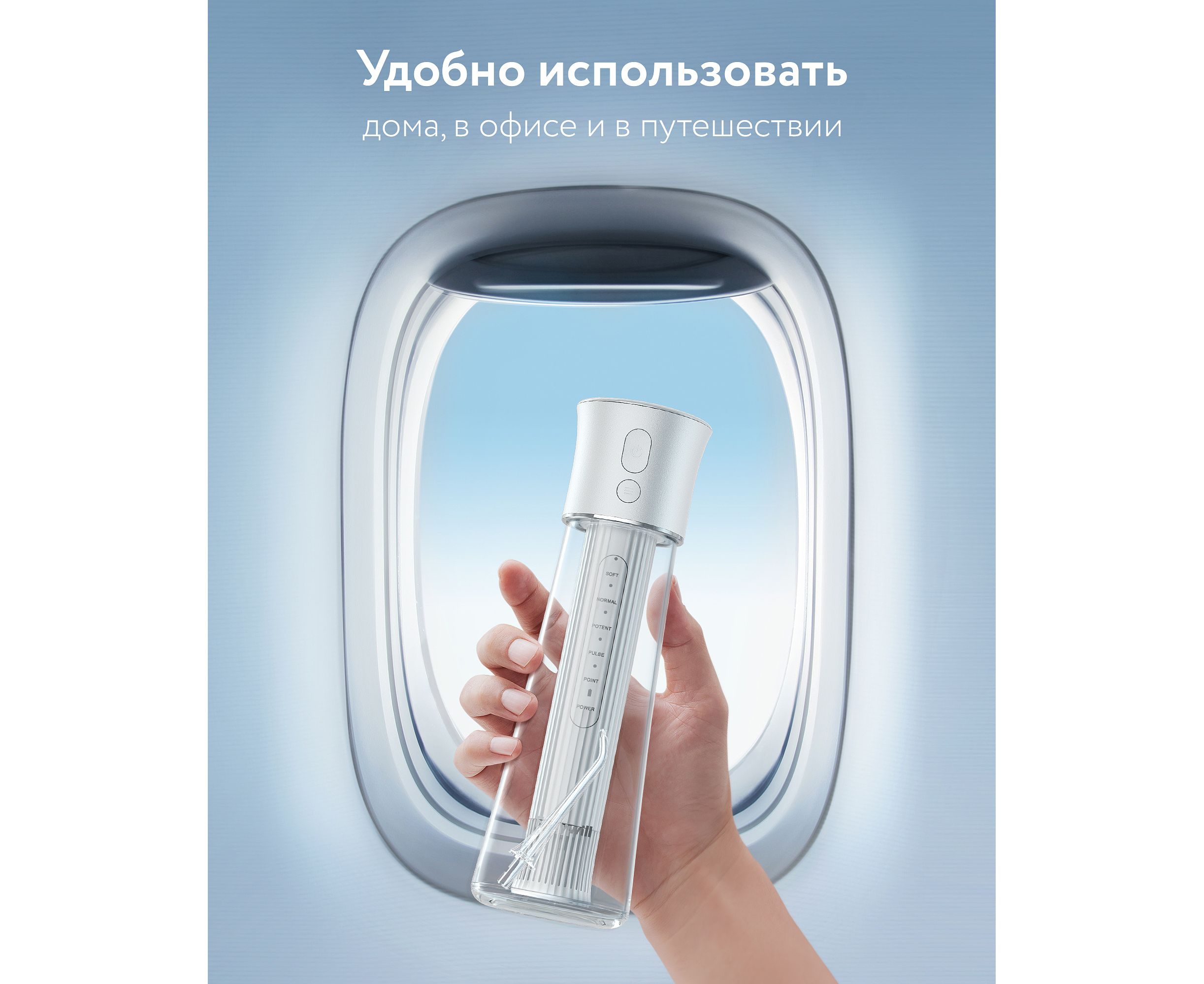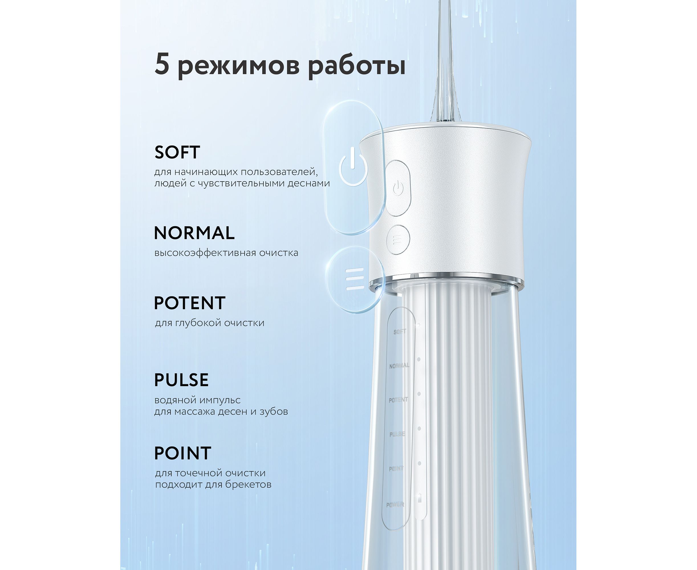-режим «Мягкий» с низким давлением воды подходит для начинающих пользователей и людей с чувствительными деснами;
