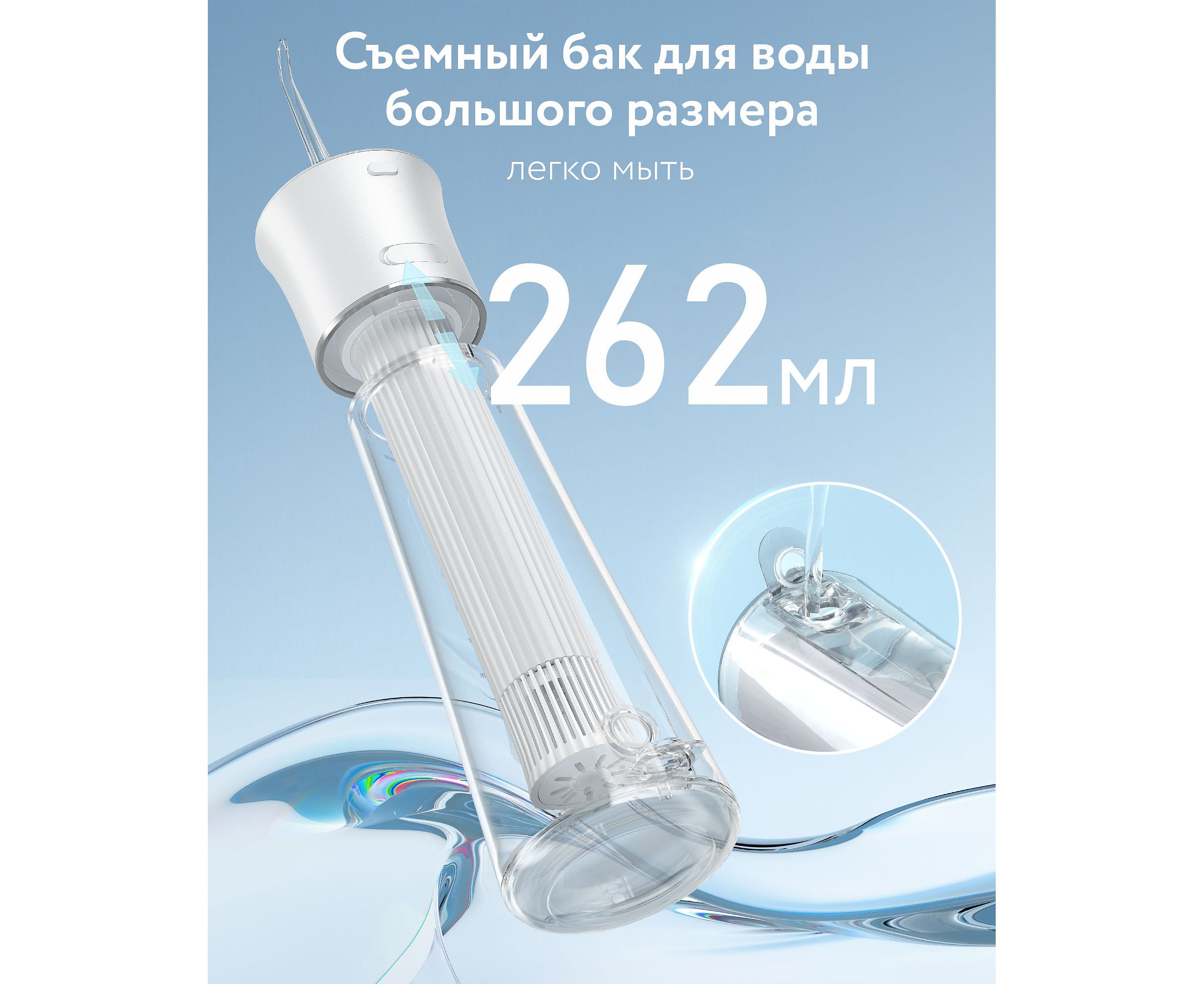 Вода в ирригаторе заливается в съемный бак объемом 300 мл, полезный объем для воды в резервуаре — 262 мл. Время зарядки ирригатора — 4 часа, зарядка осуществляется посредством USB-кабеля. Одного заряда хватает примерно на 70 дней. Благодаря водостойким свойствам (IPX7), прибор можно использовать в душе и мыть под струей воды.