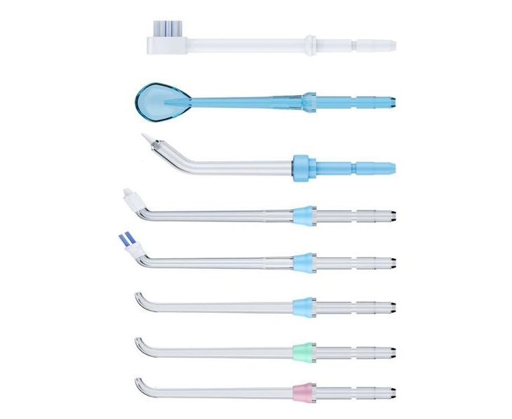 Прибор поставляется с восемью насадками для деликатного очищения межзубных промежутков, десен, языка и имплантов. Для хранения насадок предусмотрен пластиковый кейс. Также представлена текстильная сумка для размещения набора.
