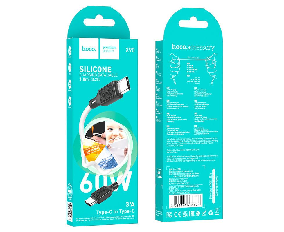 Кабель Hoco X90 Cool 60W silicone charging data cable for Type-C to Type-C - White