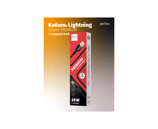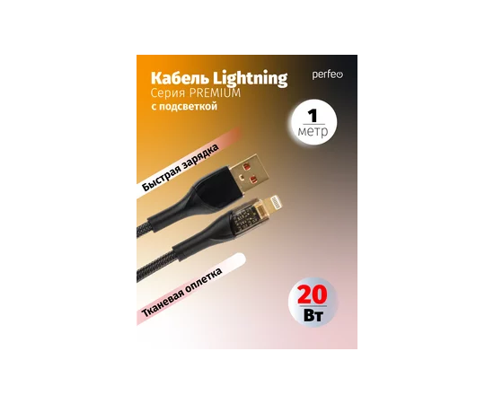 Кабель PERFEO USB А вилка - Lightning вилка, 20W, нейлон, черный, длина 1 м., PREMIUM (I4331)