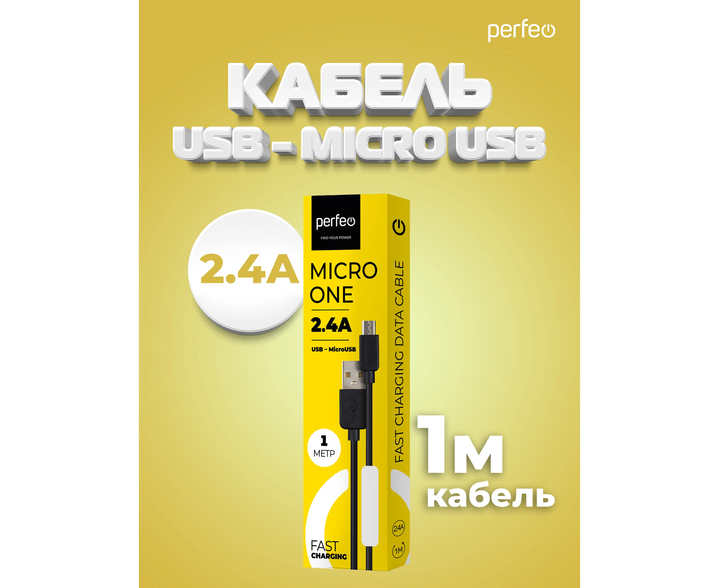 Кабель PERFEO USB A вилка - Micro USB вилка, 2.4A, черный, длина 1 м., Micro ONE (U4006)