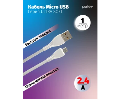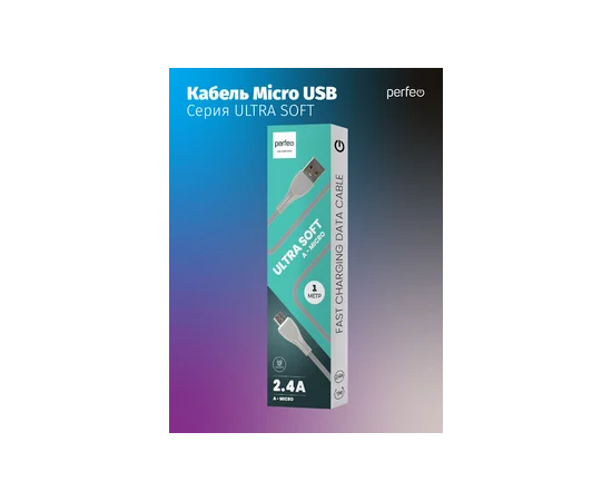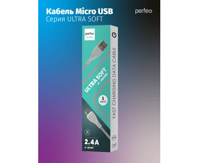 Кабель PERFEO USB A вилка - Micro USB вилка, 2.4A, серый, силикон, длина 1 м., ULTRA SOFT (U4021)