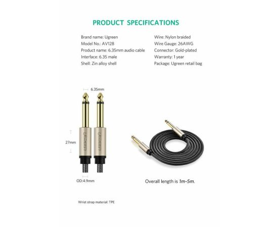 Кабель UGREEN AV128 (10639) 6.5mm Male to Male Stereo Auxiliary Aux Audio Cable 3m Gray