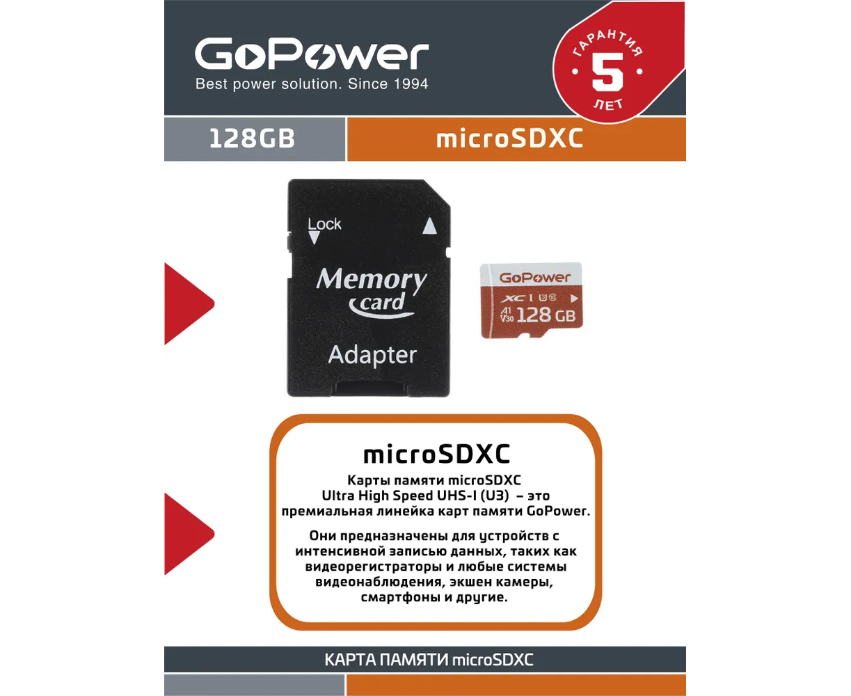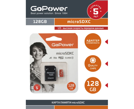 Карта памяти GoPower 00-00025682 microSD 128GB Class10 UHS-I (U3) 100 МБ/сек V30 с адаптером