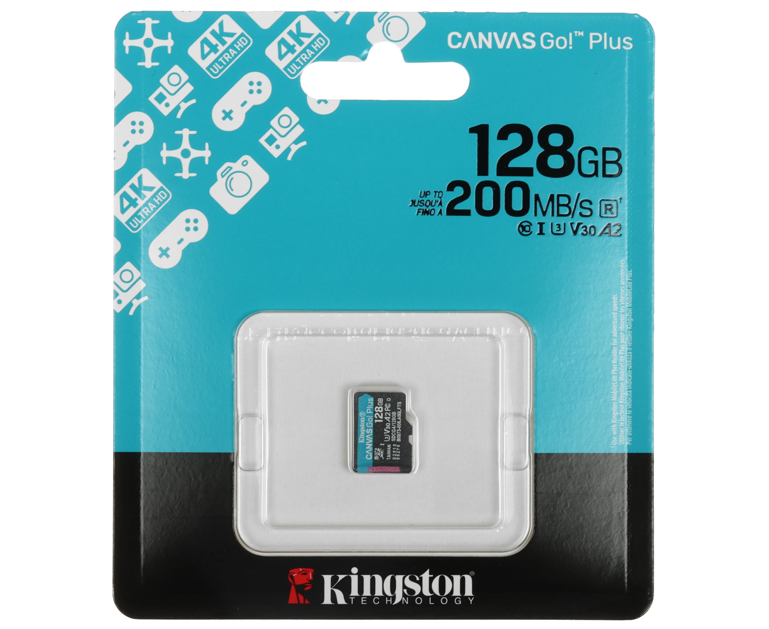 Карта памяти Kingston Canvas Go! Plus microSDXC 128 ГБ [SDCG4/128GBSP] подходит для использования в экстремальных условиях и соответствует классам скорости A2, Class 10, UHS Class 3 и Video Class 30. Изделие предназначено для смартфонов, фотокамер и других устройств.