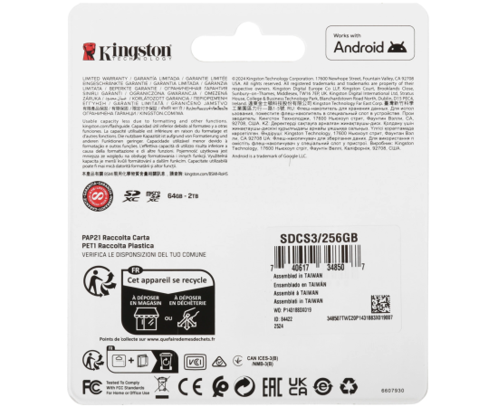 Карта памяти Kingston microSDXC 256 ГБ [SDCS3/256GB] соответствует классам скорости A1, UHS Class 1 и Video Class 10. Изделие предназначено для смартфонов, фотокамер и других устройств.