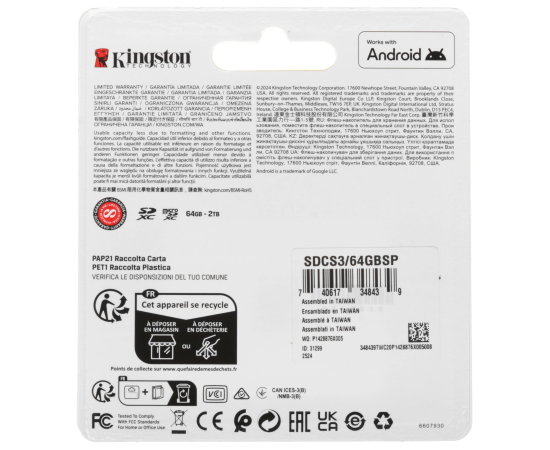 Карта памяти Kingston microSDXC 64 ГБ [SDCS3/64GBSP] пригодится владельцам смартфонов и других устройств. Модель соответствует классам скорости A1, UHS Class 1 и Video Class 10.